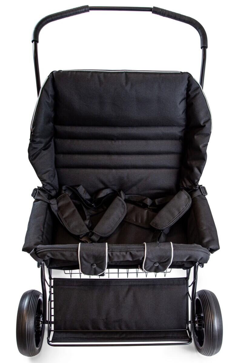 En smidig syskonvagn i textil med reglerbart rygg- och fotstöd. Ryggstöd går att ha sittläge eller viloläge. Levereras komplett med barnsele, punkteringsfria däck och svartlackerat chassi. Hjulen är avtagbara vilket förenklar rengöring och transport. Vagnen har mjuk bakhjulsfjädring. Använd alltid barnsele och håll alltid uppsikt över barn som sitter i en barnvagn. Sittmått: 25x50 cm. Bredd: 72 cm. Hjul ø 24 cm. Klädsel av 100 % polyester som är Oeko-Texcertifierad, klass 1 samt avtagbar och tvättbar i 30°. Regnskydd (52369) rekommenderas vid kraftigare regn. Chassi torkas av och rengöres vid behov för att förhindra rost. Maxvikt i vagnen är 2x22 kg och varukorgen 10 kg. Vagnens vikt 12,5 kg.