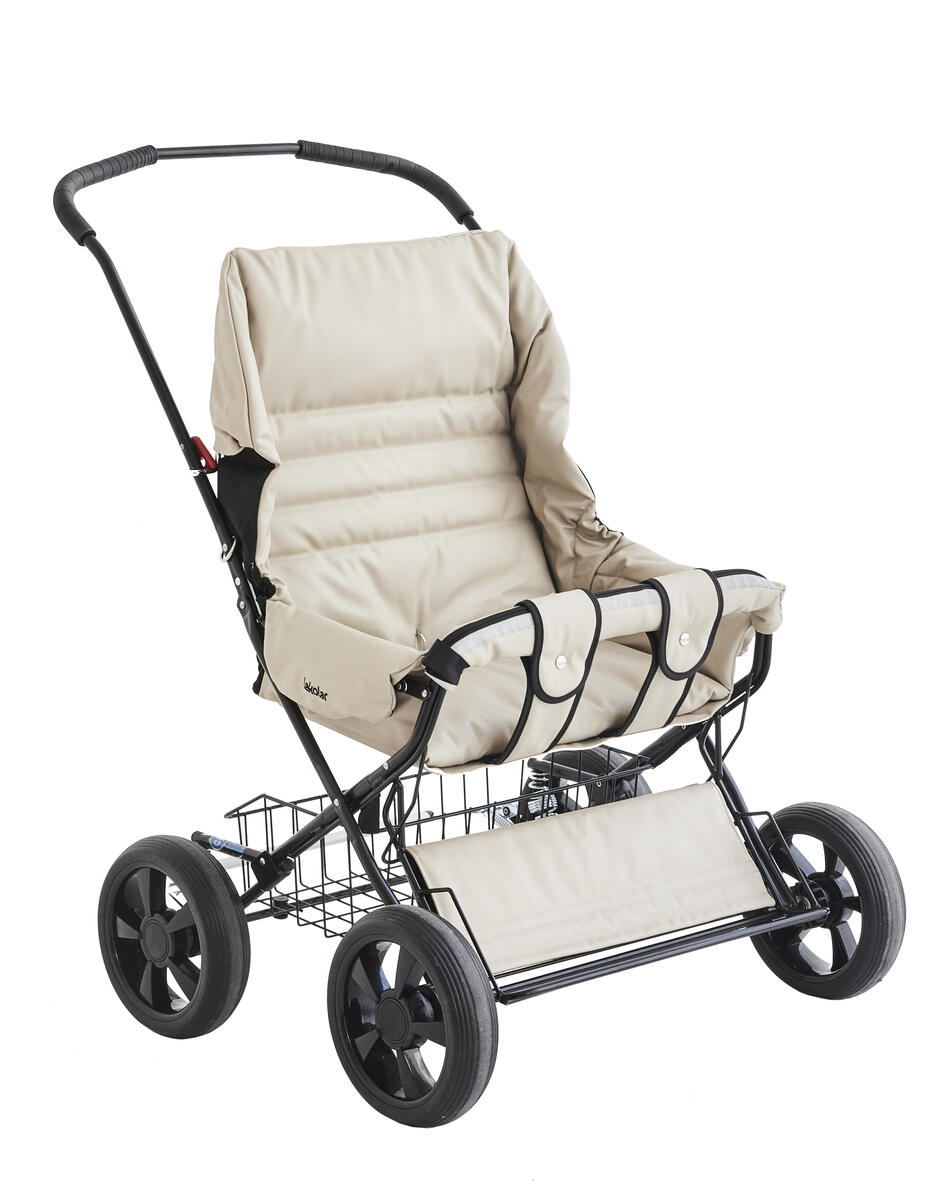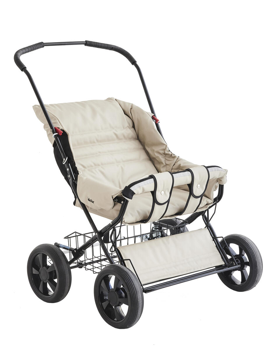 Vår populära syskonvagn för förskolan med lättskött klädsel av polyuretan. Barnvagnen är bakåtvänd, vilket ger pedagogen möjlighet att hålla ögonkontakt med barnen under färd. Vagnen levereras komplett med sufflett, fotsack, punkteringsfria däck och fyrhjulsfjädring för bättre komfort. Hjulen är avtagbara vilket förenklar rengöring och transport av vagnen. Hjulen är även försedda med kullager vilket gör vagnen lätt att köra. Vagnen har en fällbar frambåge som du enkelt kan lossa för att lättare kunna lyfta i och ur barnen. Ryggen är fällbar till liggläge. Handtaget är höj- och sänkbart i fem olika lägen från 94-103 cm. Barnsele ingår. Vagnen har Oeko-Texcertifierad klädsel, klass 1 som är PVC-fri. Maxvikt i vagnen är 2x22 kg och varukorgen 10 kg.