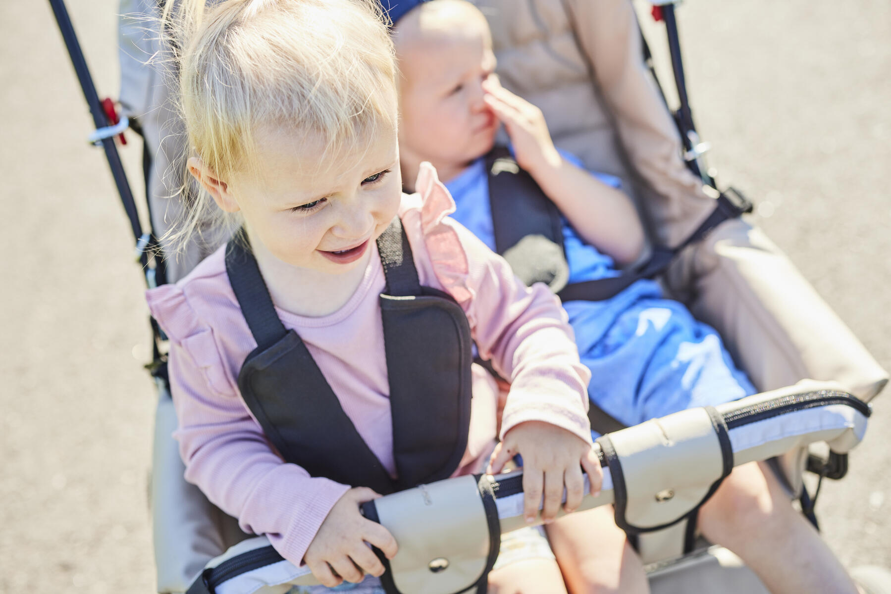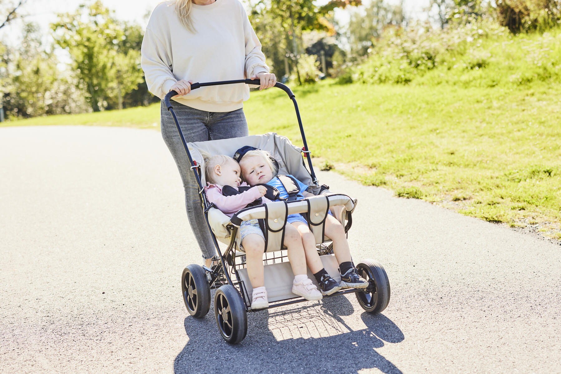 Vår syskonvagn för förskolan är klädd med ett kraftigt och vattenavvisande tyg som lätt kan torkas av. Vagnen levereras komplett med sufflett, fotsack, punkteringsfria däck och fyrhjulsfjädring för bättre komfort. Hjulen är avtagbara vilket förenklar rengöring och transport av vagnen. Hjulen är även försedda med kullager vilket gör vagnen lätt att köra och skön för barnen att sitta i. Vagnen har en fällbar frambåge som du enkelt kan lossa för att lättare kunna lyfta i och ur barnen. Ryggen är fällbar till liggläge. Handtaget är höj- och sänkbart i fem olika lägen 94–103 cm. Justerbart fotstöd. Barnsele ingår. Reflexdetaljer på sufflett och frambåge. Svartlackerat chassi. Vagnens klädsel är av 100 % polyester som är Oeko-Texcertifierad, klass 1. Maxvikt i vagnen är 2x22 kg och varukorgen 10 kg.