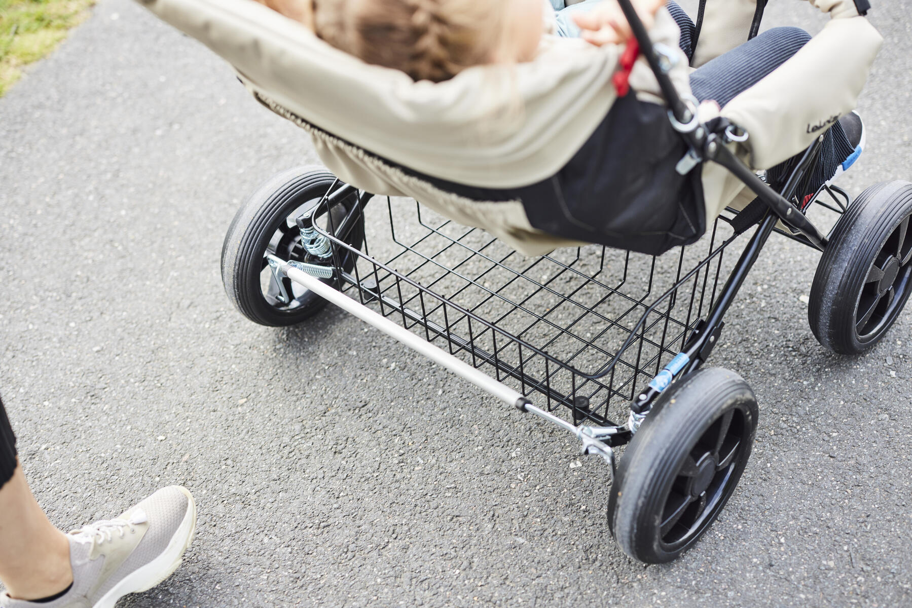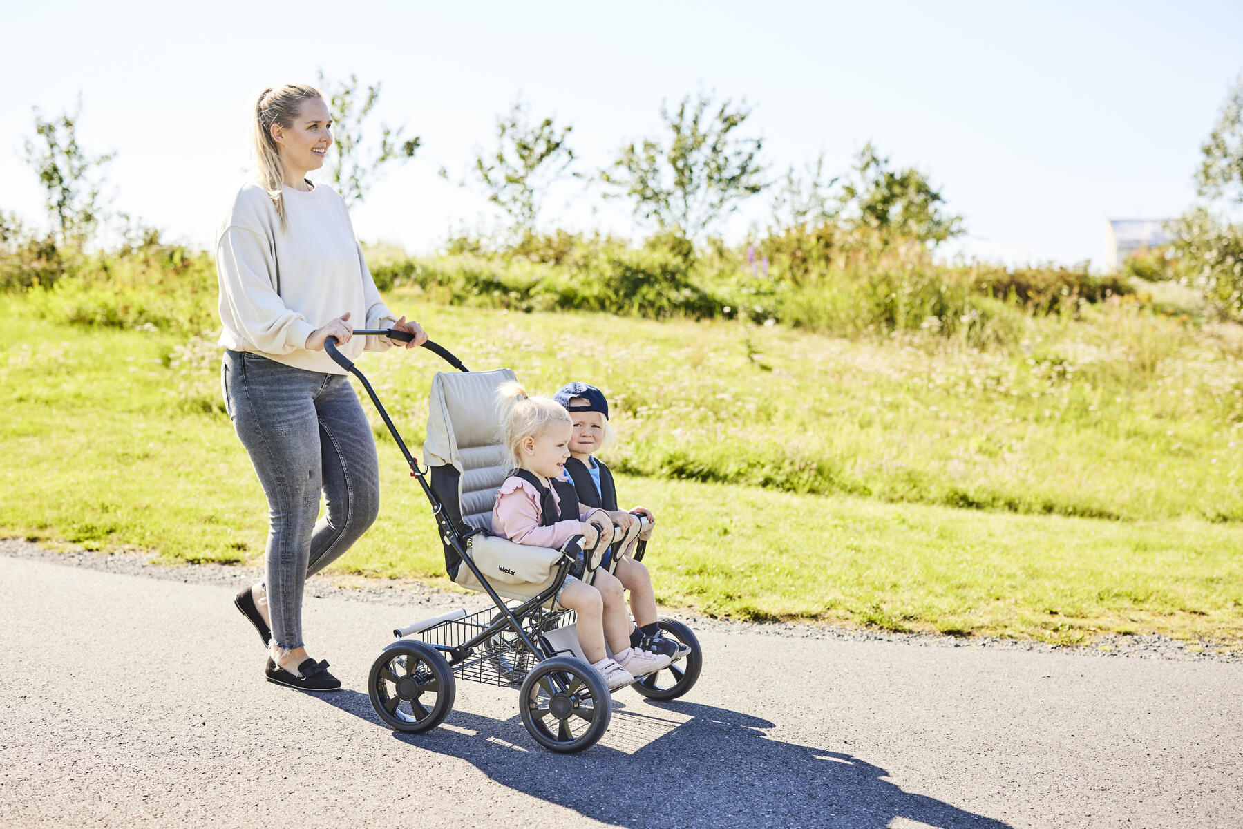 En smidig syskonsulky med klädsel av polyuretan, som är lätt att torka av. Reglerbart rygg- och fotstöd. Levereras med barnsele, punkteringsfria däck och svart lackerat chassi. Hjulen är avtagbara vilket förenklar rengöring och transport av vagnen. Vagnen har bakhjulsfjädring och reflexdetaljer på frambågen. Klädseln är avtagbar. Använd alltid barnsele och håll alltid uppsikt över barn som sitter i en barnvagn. Maxvikt i vagnen är 2x22 kg och varukorgen 10 kg.