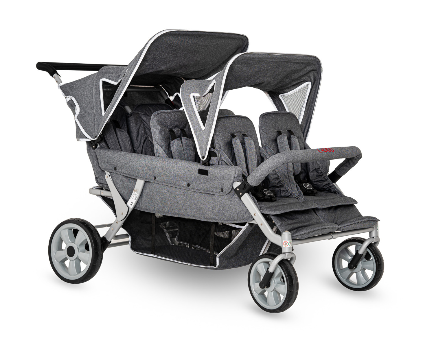En praktisk och stabil sittvagn med plats för 4 barn. Framhjul med svirvelfunktion gör det enklare att svänga. Vagnen är utrustad med fotbroms med hjullåsning och fotstödet är justerbart. Enkel att fälla ihop. Vattenavstötande tyg med reflex där sätena går att fälla 45° till viloläge och barnsele ingår. Avtorkningsbar. Stor och rymlig varukorg under sätena. Sittmått: cirka 30 cm. Mått: B84xL110xH110 cm. Max vikt: 18 kg per säte. Vagnen rekommenderas för användning för barn från 6 månader. Levereras omonterad.