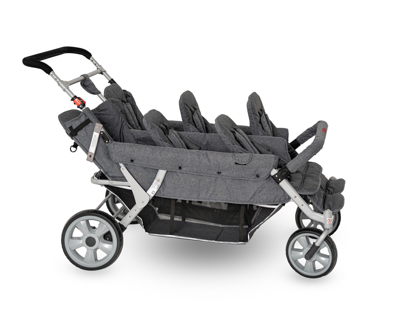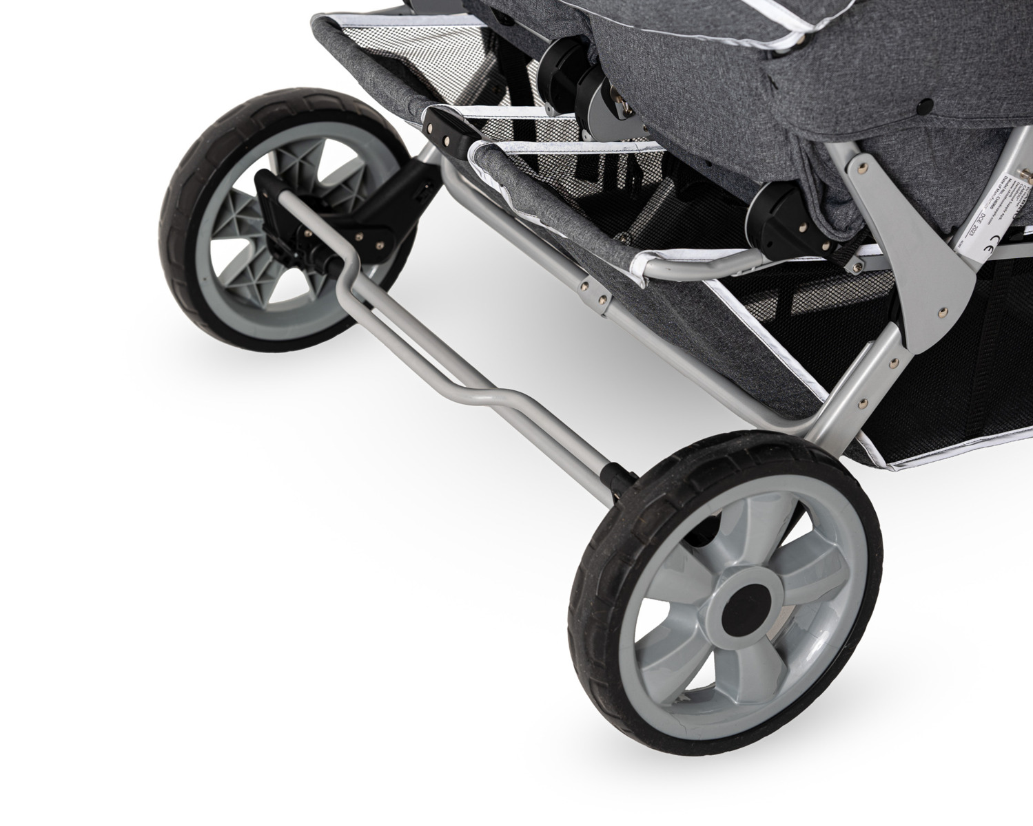 En stabil och praktisk sittvagn med plats för 4 barn. Stora punkteringsfria hjul av EVA gör vagnen lämplig för användning även i ojämn terräng. Framhjul med svirvelfunktion gör vagnen lättkörd. Stor och rymlig varukorg. Enkel att fälla ihop. Som extra säkerhet stannar vagnen om du släpper handtaget. Har även fotbroms med hjullåsning. Sittdelarna har ett viloläge, ca 30 grader. Barnsele ingår. Sittmått 30 cm. Mått: B86xL127xH96 cm. Maxvikt 15 kg/säte. Vagnen rekommenderas för användning för barn från 6 månader.