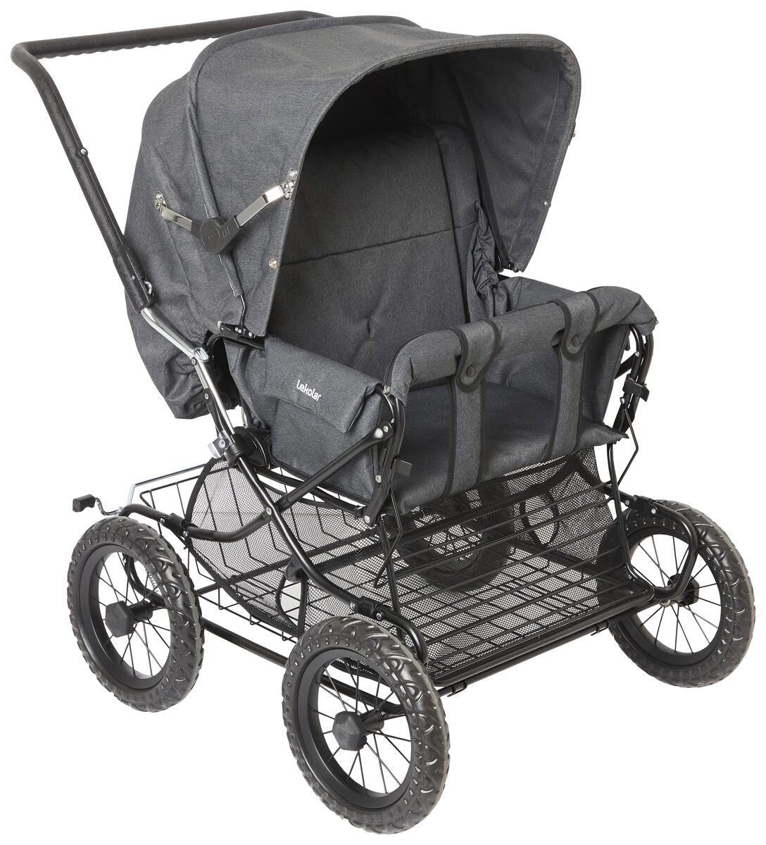 En syskonvagn med sufflett för förskolan i vattenavvisande tyg. Helt säte och varukorg. Ryggen går att ha i sittläge, viloläge samt fullt liggläge. Vagnen har punkteringsfria däck och fyrhjulsfjädring för en bättre komfort. Hjulen är försedda med kullager vilket gör vagnen lätt att köra och skön för barnen att sitta i. Hjulen är avtagbara vilket förenklar rengöring och transport av vagnen. Justerbart fotstöd. Vagnen har en fällbar frambåge som du enkelt kan lossa för att lättare kunna lyfta i och ur barnen. Fempunktssele ingår. Svartlackerat chassi. Bredd 74 cm. Handtaget är höj- och sänkbart i fem olika lägen 94–103 cm. Maxvikt i vagnen är 2x22 kg och varukorgen 10 kg. Sittmått: 49x28 cm. Ryggstöd: 92 cm. Hjul: ø30 cm. Vagnens klädsel är av 100 % polyester som är Oeko-Texcertifierad klass 1. Avtorkningsbar.