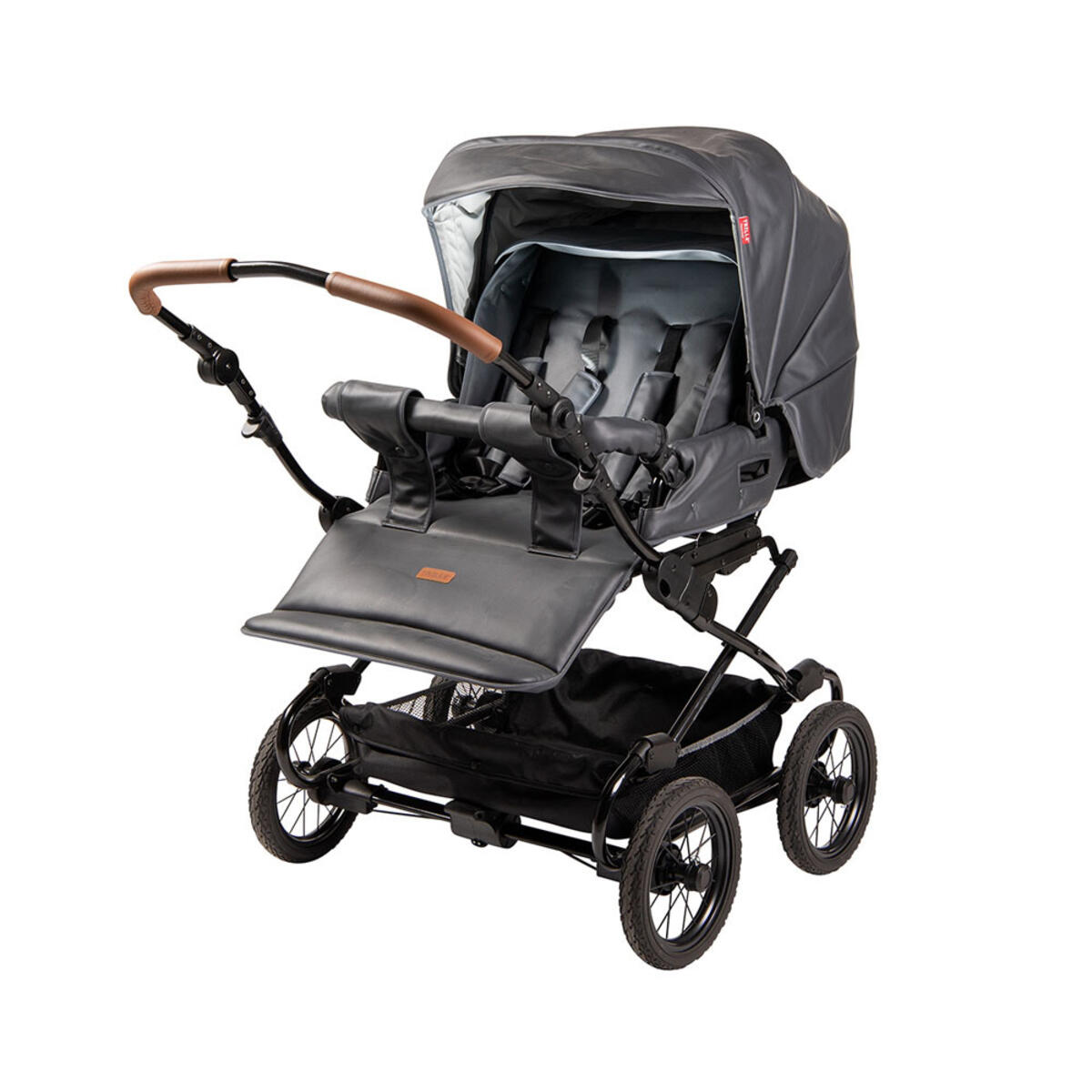 En smidig syskonsulky med klädsel av polyuretan, som är lätt att torka av. Reglerbart rygg- och fotstöd. Levereras med barnsele, punkteringsfria däck och svart lackerat chassi. Hjulen är avtagbara vilket förenklar rengöring och transport av vagnen. Vagnen har bakhjulsfjädring och reflexdetaljer på frambågen. Klädseln är avtagbar. Använd alltid barnsele och håll alltid uppsikt över barn som sitter i en barnvagn. Maxvikt i vagnen är 2x22 kg och varukorgen 10 kg.