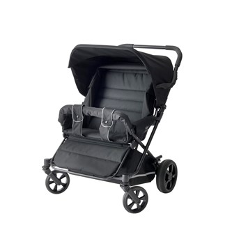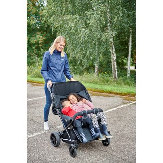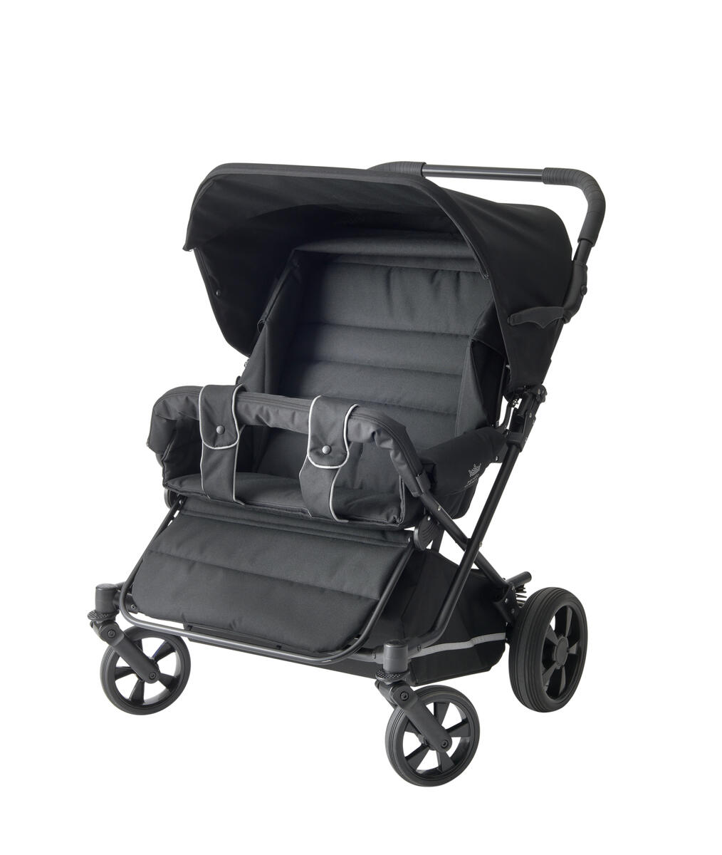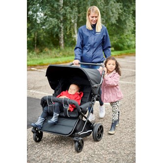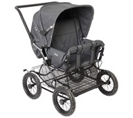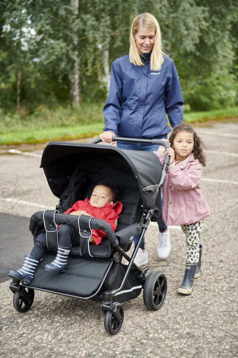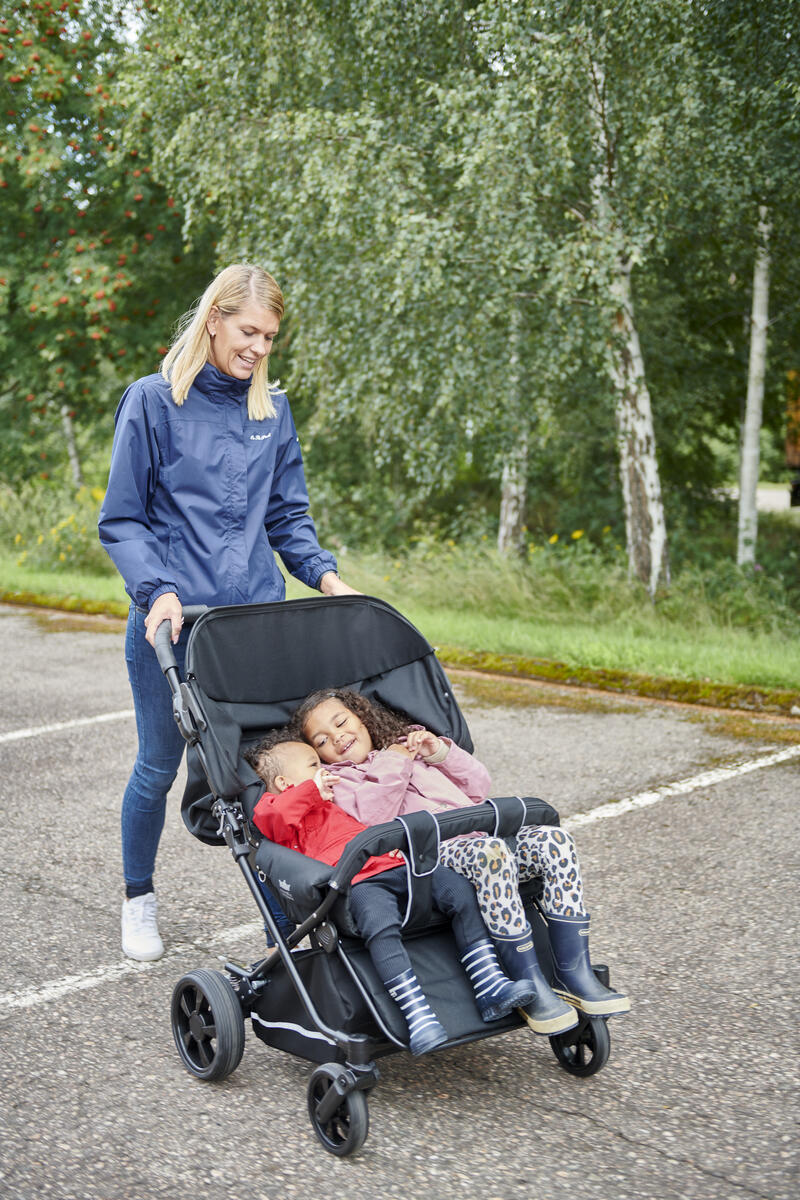 En lättkörd sittvagn för förskolan med punkteringsfria och svängbara hjul med låsfunktion. Bakhjulsfjädring som ger en mjuk åktur för barnen. Syskonsulkyn har en vadderad sits med mjuka armstöd. Reglerbart fotstöd och ryggen är fällbar till liggläge. Handtaget är justerbart i fem olika lägen 98-108 cm. Reflexer i alla riktningar. Sufflett med solskyddsfaktor på 40+ ingår. Sele ingår. Sitsmått: 25x50 cm. Bredd totalt: 75 cm. Vagnen är försedd med varukorg som tar en maxlast på 10 kg. Vagnens maxlast är 2x22kg. Oeko-Texcertifierad textil. Avtorkningsbar och avtagbar klädsel. PVC-fri. Vikt: 16,5 kg.