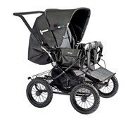 Vår syskonvagn för förskolan är klädd med ett kraftigt och vattenavvisande tyg. Vagnen levereras komplett med sufflett, fotsack, punkteringsfria däck och fyrhjulsfjädring för bättre komfort. Hjulen är avtagbara vilket förenklar rengöring och transport av vagnen. Hjulen är även försedda med kullager vilket gör vagnen lätt att köra och skön för barnen att sitta i. Vagnen har en fällbar frambåge som du enkelt kan lossa för att lättare kunna lyfta i och ur barnen. Ryggen är fällbar till liggläge. Handtaget är höj- och sänkbart i fem olika lägen 94–103 cm. Barnsele ingår. Reflexdetaljer på sufflett och frambåge. Svartlackerat chassi. Vagnens klädsel är av 100 % polyester som är Oeko-Texcertifierad, klass 1. Maxvikt i vagnen är 2x22 kg och varukorgen 10 kg.