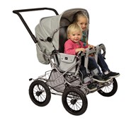 En syskonvagn med sufflett för förskolan i vattenavvisande tyg. Helt säte och varukorg. Ryggen går att ha i sittläge, viloläge samt fullt liggläge. Vagnen har punkteringsfria däck och fyrhjulsfjädring för en bättre komfort. Hjulen är försedda med kullager vilket gör vagnen lätt att köra och skön för barnen att sitta i. Hjulen är avtagbara vilket förenklar rengöring och transport av vagnen. Justerbart fotstöd. Vagnen har en fällbar frambåge som du enkelt kan lossa för att lättare kunna lyfta i och ur barnen. Fempunktssele ingår. Svartlackerat chassi. Bredd 74 cm. Handtaget är höj- och sänkbart i fem olika lägen 94–103 cm. Maxvikt i vagnen är 2x22 kg och varukorgen 10 kg. Sittmått: 49x28 cm. Ryggstöd: 92 cm. Hjul: ø30 cm. Vagnens klädsel är av 100 % polyester som är Oeko-Texcertifierad klass 1. Avtorkningsbar.