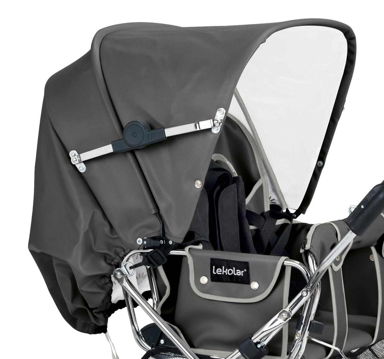Regnskydd för syskonvagnar. Med kardborrband och reflex. Regnskyddet har en stor öppning fram för att enkelt hjälpa barnen in eller ut. Passar till alla våra syskonvagnar med sufflett. Av nylon.