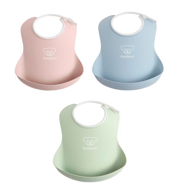 En styvare haklapp som är praktisk och lätt att rengöra under rinnande vatten eller i diskmaskin. Justerbar halsknäppning. Säljs i styck i blandade färger. Av LDPE-plast. Från 6 månader.