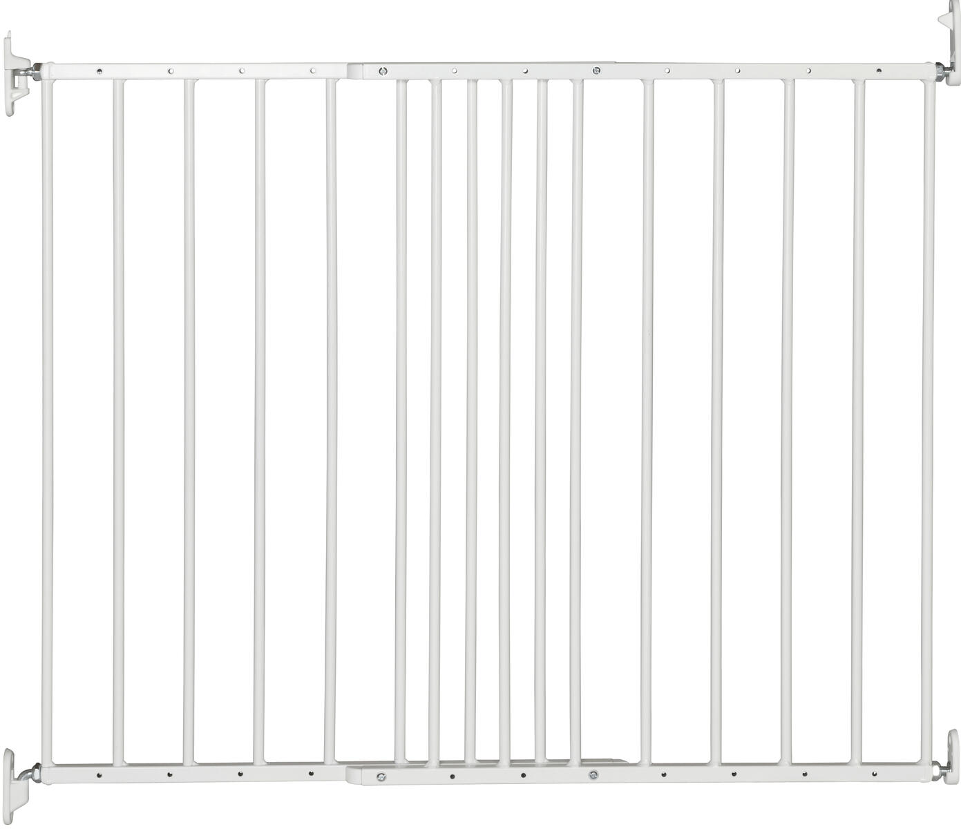 Stor och stadig grind i vitlackad bok som tål att användas i förskola. Försedd med stödbeslag nedtill som förhindrar att barn hänger ner en öppnad grind. Rejäl låsning som är lätt för vuxna att förstå hur den ska hanteras. Fri passage utan list nedtill. Grinden skruvas fast i eller framför dörrkarm eller öppning. Ställbar inuti en öppning från 91,5 till 133 cm och ställbar framför öppning från ca 80 till 121 cm. Godkänd enligt EN1930.