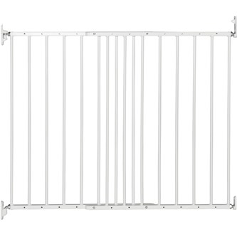 Barngrind i vit metall med "quick release"-funktion så att grinden enkelt går att montera av och på. Passar såväl vänster- som högerhängda dörrar. Grinden kan öppnas med en hand och åt båda hållen. En enkel och stabil barngrind. Uppfyller EN 1930:2011.