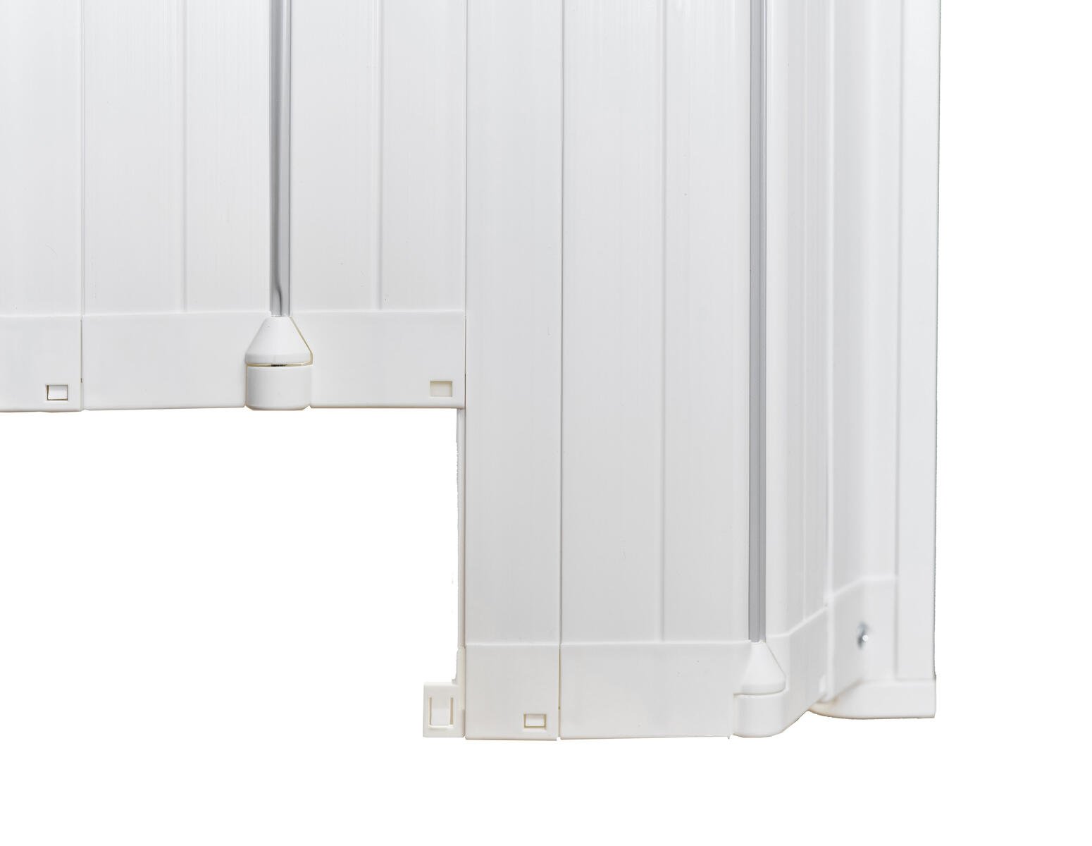 Vikbar barngrind utan tröskel som går att montera både på vänster och högerhängda dörrar. Fälls automatiskt tillbaka när den inte används. Bredden går att justera mellan 55-89 cm. Höjd 74 cm. Vid fästning utanför dörröppning 55-79,5 cm. Vid fästning i dörröppning 64,5-89 cm.