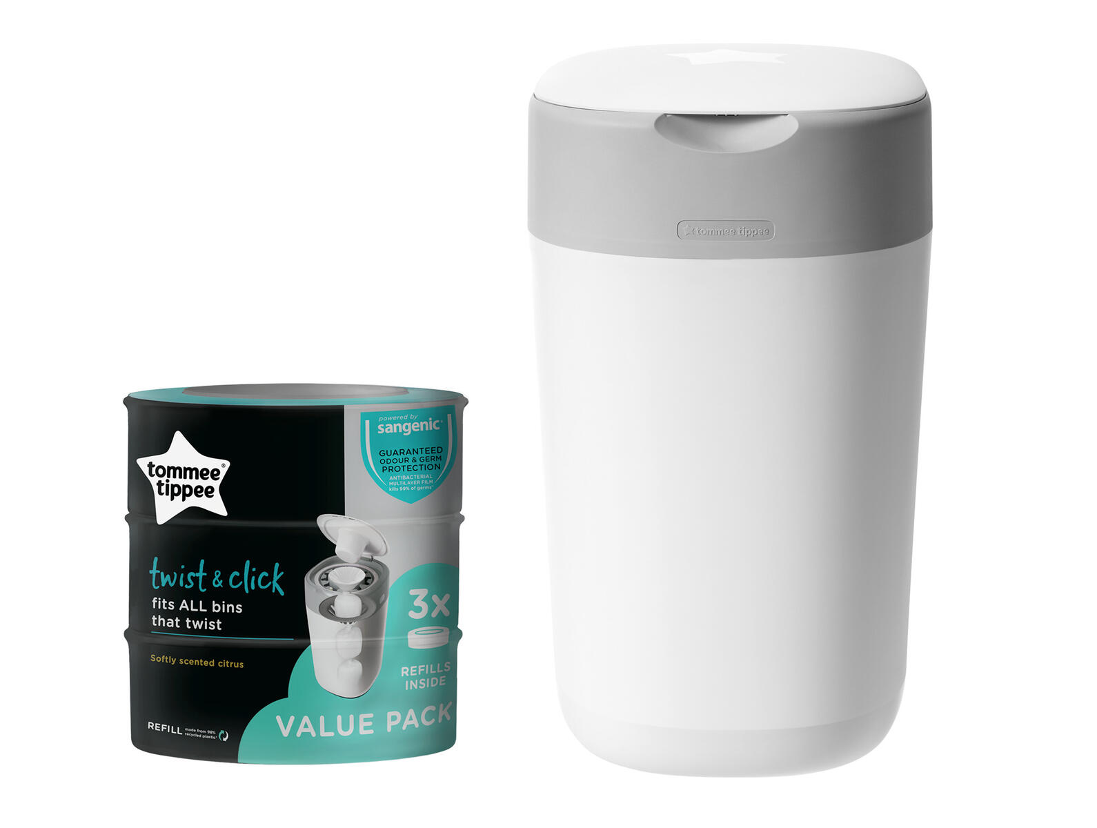 Lätt att använda. Den speciella twist and seal-konstruktionen förseglar blöjan, vilket förhindrar dålig lukt. Ergonomiska handtag gör det lätt att flytta hinken. Rymmer ca 60 blöjor. Tillverkad av återvunnen PP. Inklusive 1 refill kassett. Höjd 77,5 cm.