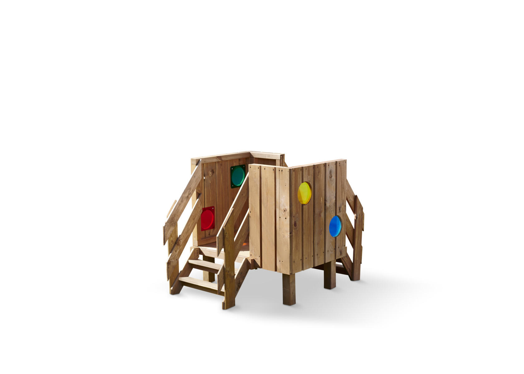 Vårt sensoriska torn är utmärkt för att främja barnens grovmotoriska utveckling, koordination och balans. Det erbjuder oändliga timmar av lek och rörelse i utemiljön och är ett mångsidigt inslag som enkelt kan integreras i rolleken. Tornet stimulerar barnen till aktiv och underhållande lek medan de springer runt och utforskar de spännande titthålsfönstren. När ljuset bryts genom det färgade plexiglaset skapas fantastiska sensoriska upplevelser som stimulerar det visuella sinnet. Barnen tar sig upp på plattformen via två trappor med räcke. Tillverkad av FSC-certifierad furu som är ytbehandlad med en vattenbaserad lack. För markförankring behövs 4 st av 161297, eller 151133 för ytmontering. Levereras omonterad.