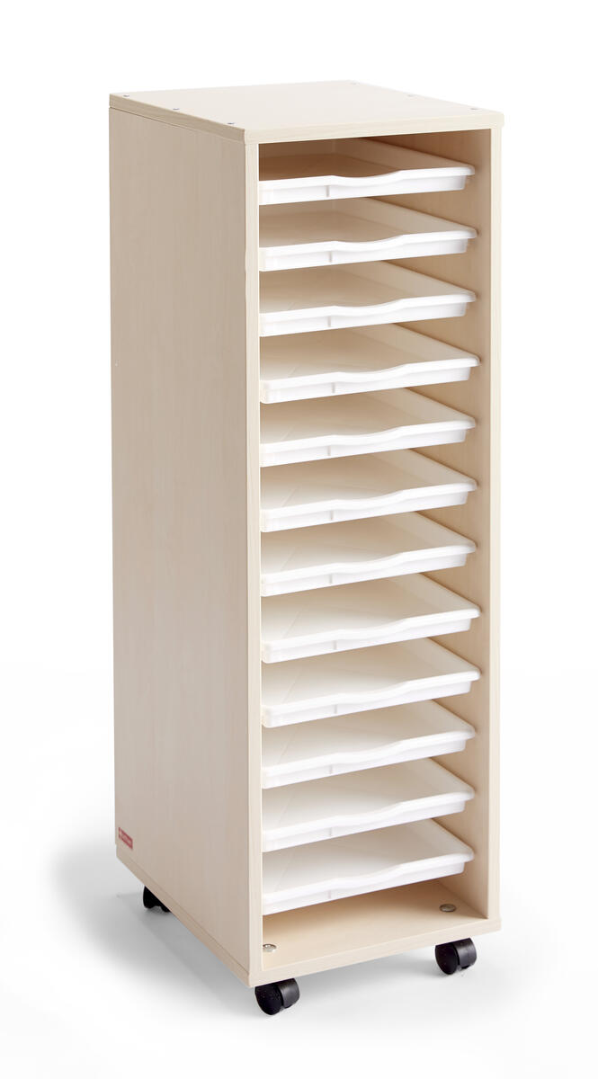 En smart hjulförsedd förvaringslösning med brickor. Passar bra för många olika aktiviteter som man inte hunnit färdigställa och ändå måste plocka undan. Av MDF. Mått: 106x35x41 cm, mått på bricka 37,5x31x3 cm. Levereras omonterad.
