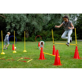 Ett stort härligt aktivitetspaket för träning, gymnastik, koordinationsträning eller bara som ett roligt inslag på rasten. Produkterna går utmärkt att använda var för sig eller som stationer. Setet innehåller 2 löpstegar, 16 koordinationsringar, 12 returhäckar i 2 olika storlekar, 6 slalomstolpar, 12 stavar att ställa i konerna samt fästen till dem, 24 markeringskoner med tillhörande konhållare samt 8 större koner med hål.