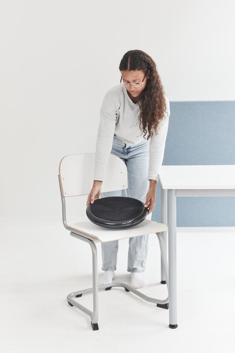 Luftfylld ergonomisk balanskudde som underlättar ergonomi och rastlösa ben i klassrummet. Eleverna kan därmed röra sig utan att tappa koncentrationen för en ökad studiero. Sittkuddens knottriga sida ökar blodcirkulation och känselstimulering. Kuddens andra sida med små kulor passar perfekt att sitta eller stå på. Placera kudden på en stol eller lägg den direkt på golvet för balansövningar, massage och muskelträning. Maxvikt: 100 kg. Mått: 25 cm. Material: Ftalat-fri PVC. Från 3 år.