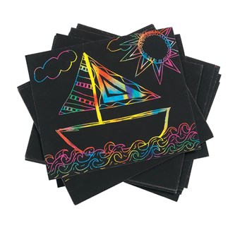 100 ark/fp. Lättarbetad skrapkartong med svart yta. Motivet framträder regnbågsfärgat. Använd skrapverktyg i plast eller trä. Mått: 15x15 cm. PVC-fri.