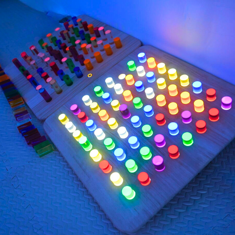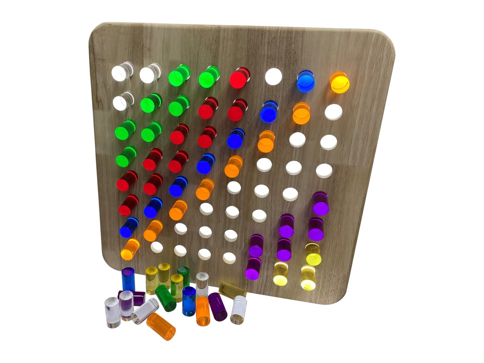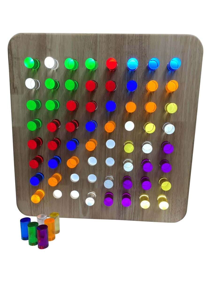Designad för att passa ljusbordet 118666. Med 64 hål där ljuset skiner igenom och där de färgade cylindrarna sätts. Experimentera med färger och skapa mönster. Se hur färgerna ändras när du byter färgen på ljusbordet. Brädan är i trä och cylindrarna i akrylplast. Mått: 57x57x1,8 cm. Från 3 år.