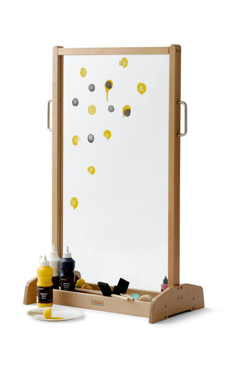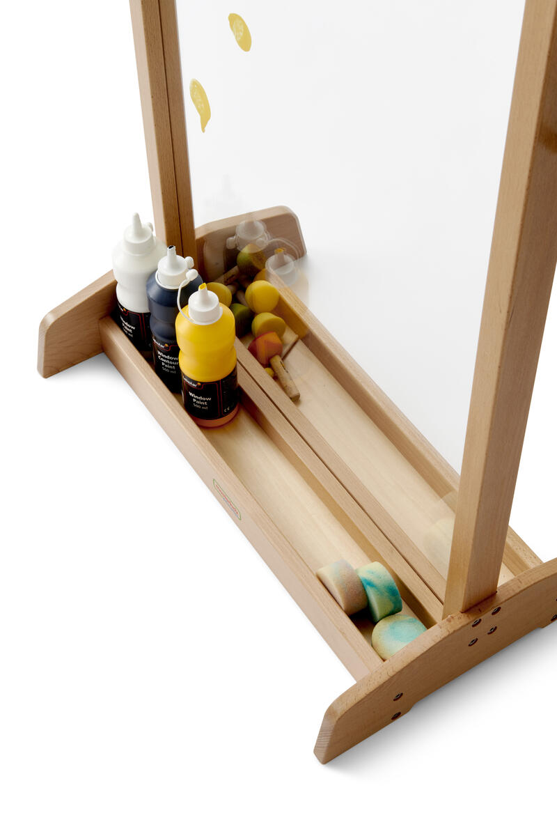 Dubbelsidigt golvstaffli på stadig bas. Arbetsyta av akrylglas. Papper eller plastfilm fästs enkelt på glaset med maskeringstejp eller vid stommen. Det går bra attt använda våra fönsterfärger, målas först på plastfilm. Motivet kan efter torkning tas loss från plastfilmen och fästas på plana ytor, såsom fönster och glas. Fäster ej permanent, utan kan flyttas om och om igen. I basen finns ett grunt fack på varje sida. Handtag på långsidorna. Mått: B64xH106xD40 cm, arbetsyta B55xH98 cm, fackdjup 8 cm. Totalvikt 10 kg. Levereras omonterat. Monteringsanvisning medföljer. Tillverkat av FSC-certifierat trä. Stomme av massiv bok, skivor i plywood lackad med vattenbaserat lack. Rengör med fuktig trasa och milt diskmedel innan färg har torkat. CE-märkt. PVC-fri.