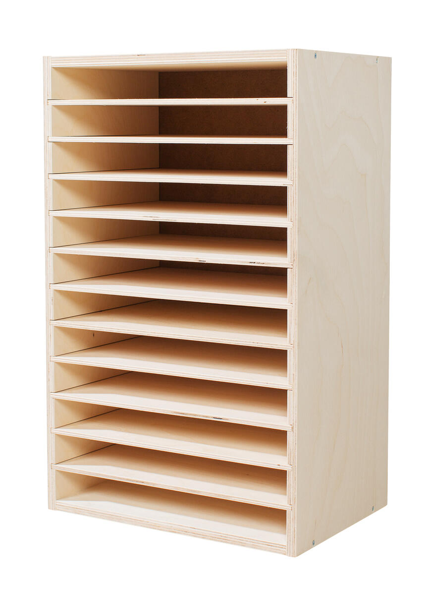 Mobil torkställning med 30 hyllor i metall. För material upp till A3-format. Låsbara hjul. Mått: 42,5x48x121 cm. Levereras omonterad. Monteringsanvisning medföljer. Tillverkad av lackad björk. FSC-märkt. PVC-fri.