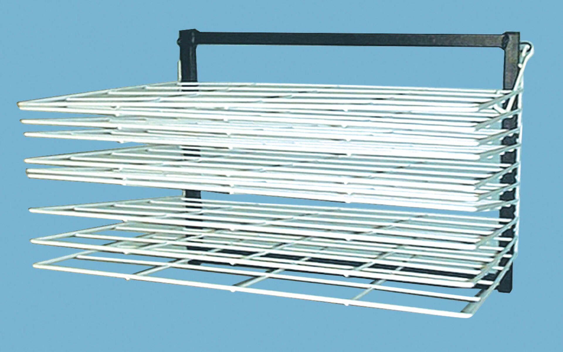 Torkställning för vägg med 10 hyllor, material upp till A3-format. Monteras på vägg. Hyllorna kan fällas upp när de inte används för att spara plats. Mått: 50x41x36 cm. Av stål.