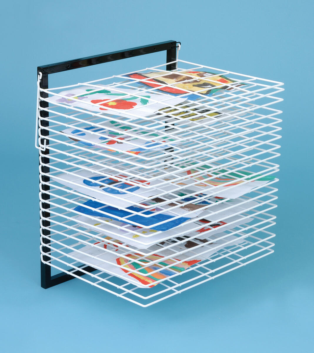 Torkställning för vägg med 20 hyllor, material upp till A3-format. Monteras på vägg. Hyllorna kan fällas upp när de inte används, för att spara plats. Mått: 50x41x61 cm. Av stål.