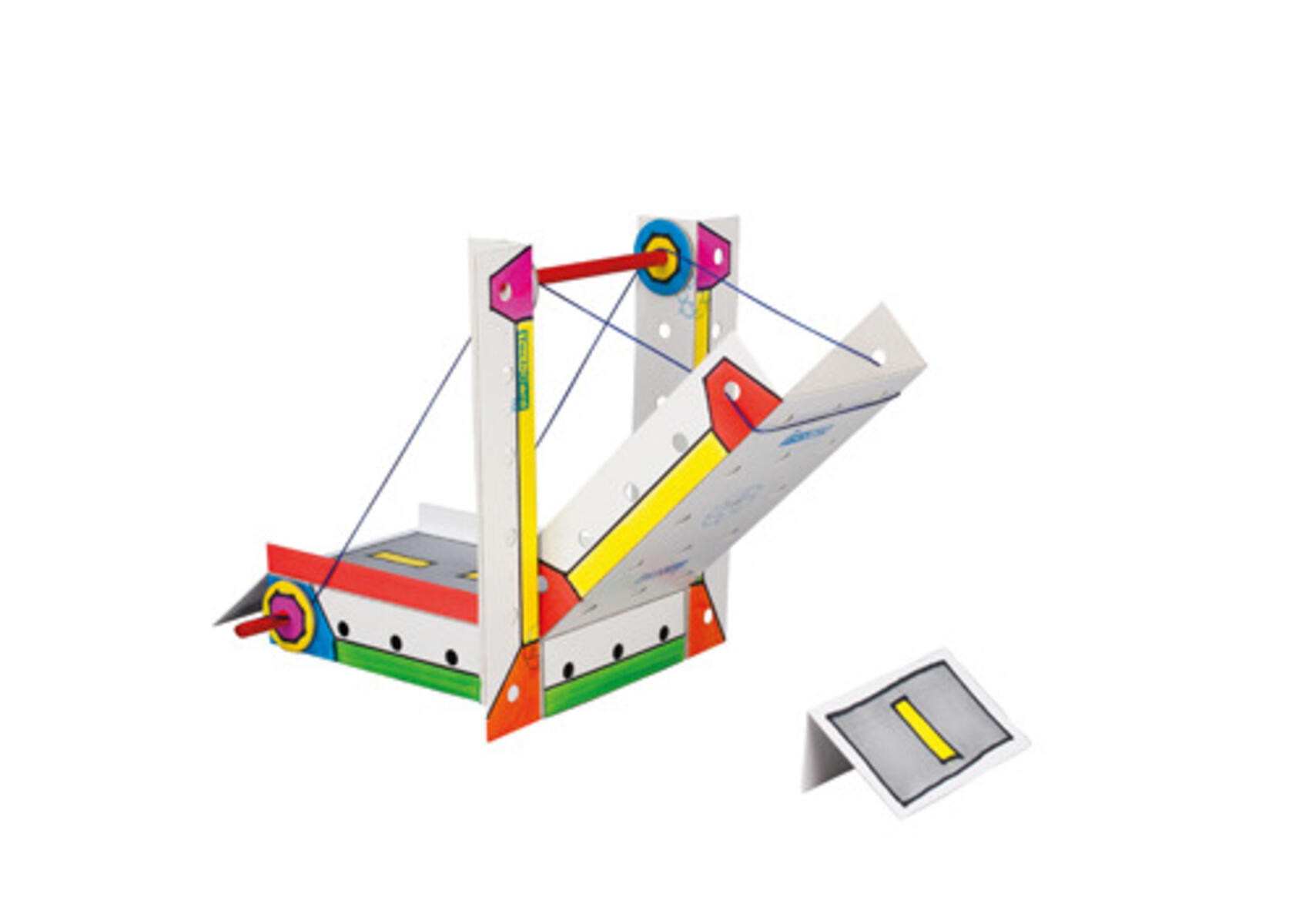 Byggsystem med enkla grundmaterial som lätt kan sättas ihop till modeller som visar konstruktioner och hur man kan utnyttja krafter på olika sätt. Innehåll: bitar av kartong för att bygga en klaffbro, snöre, rundstav samt beskrivning (engelsk text). Material: kartong och snöre. Modellen visas målad.