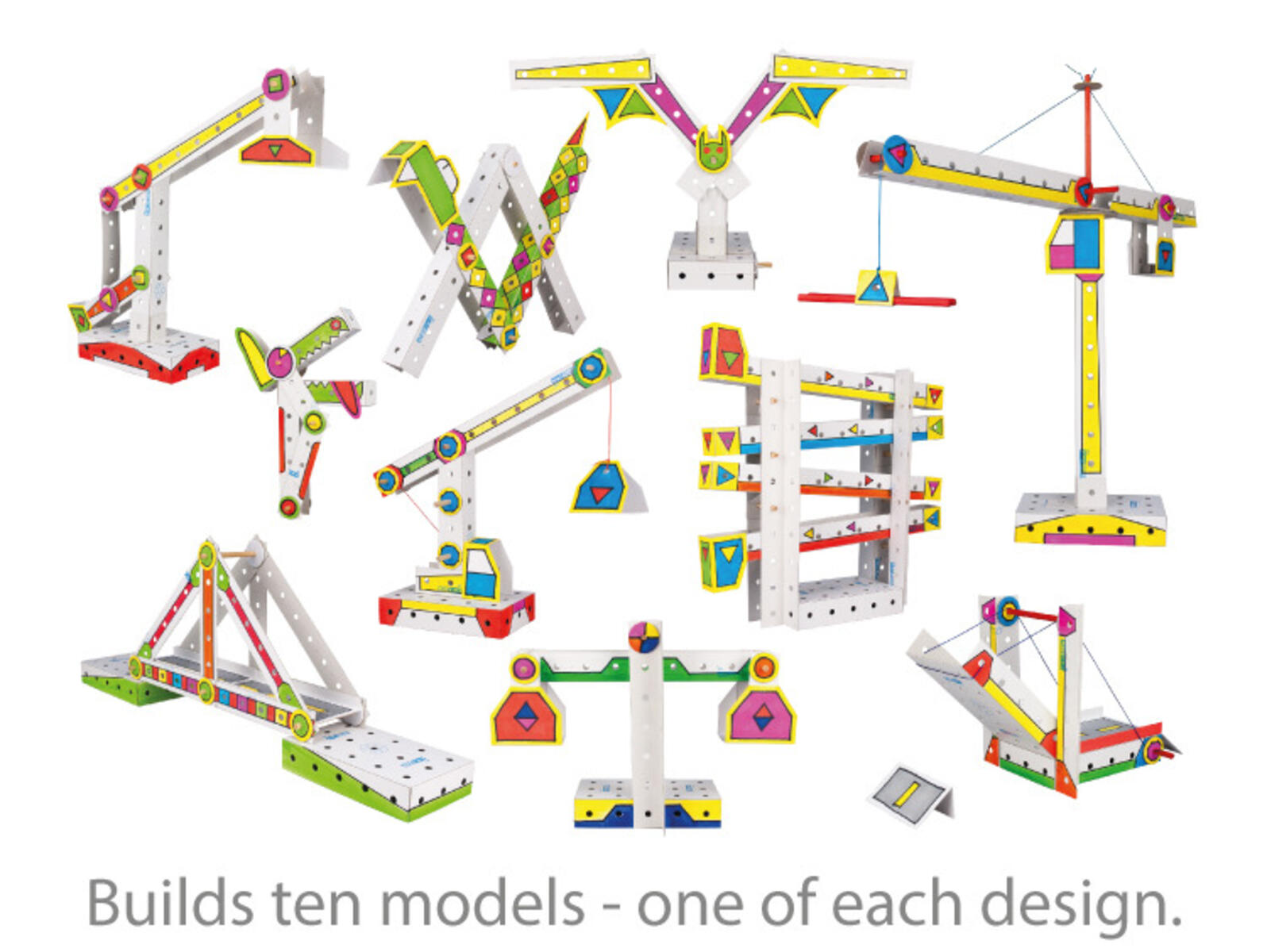 Material för att bygga och måla 10 olika modeller som visar konstruktioner som utnyttjar kraft på olika sätt. Modellerna visas målade.