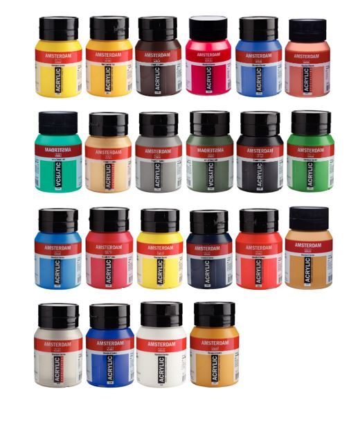 6x500 ml/fp. Vattenbaserad akrylfärg i mycket hög kvalitet som kan användas på de flesta underlag, t.ex. papper, målarduk, pannåer, trä och lera. Torkar till en slät sidenmatt yta. Penslar och verktyg rengöres omedelbart i vatten före torkning. Vattenfast efter torkning. Ingår: 1 x Process yellow (gul), 1 x svart mars (svart), 1 x Process magenta (röd), 1 x Process cyan (blå) och 2 x titanium white (vit).