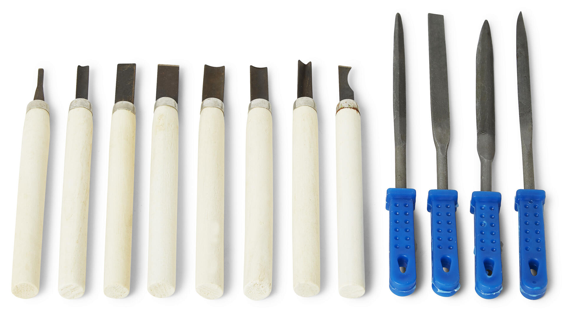 12 delar/fp. Set med järn och filar för skulptur och bildhuggning i mjukare material, t.ex. 40315/skulpturblock. 8 järn med träskaft: breda och smala vinklar, rundade och platta spetsar, längd ca 13,5 cm. 4 smala filar med plasthandtag: rund, platt och spetsig, längd ca 17,5 cm. Konstnärsmaterial.
