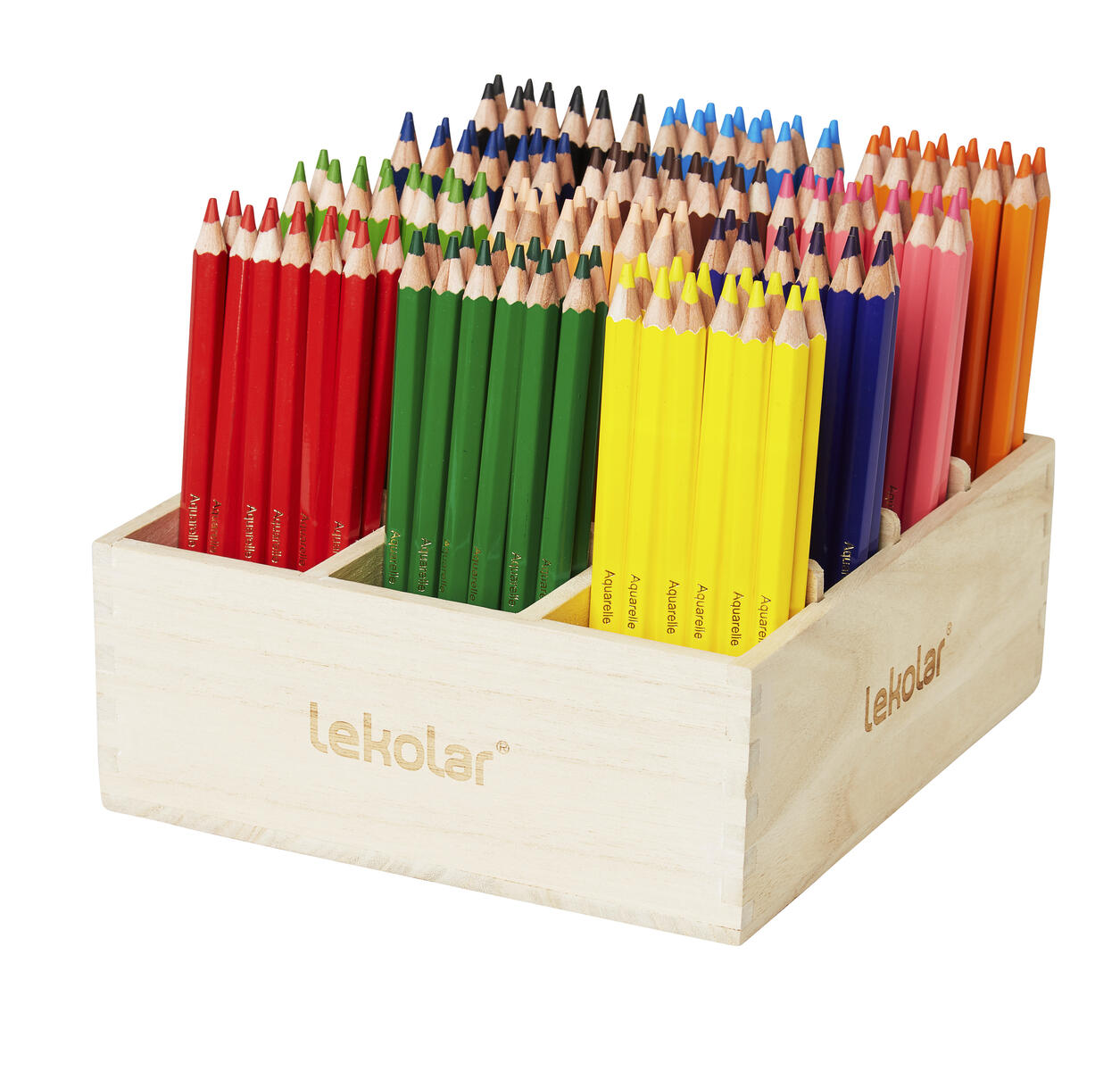 144 st. 12 x 12 färger. Färgpennor som passar för både torr färgläggning och akvarellmålning. Extra mjukt, hållbart färgstift av kvalitetspigment. Färgerna är blandbara med varandra, vilket ger en akvarelleffekt när man målar över målningen med vatten. Hexagonal pennkropp med lackerad topp. Ingår lila, aprikos, orange, mörkgrön, grön, mörkblå, blå, röd, rosa, svart, gul, brun och en pensel. Träställ. FSC-märkt. PVC-fri.