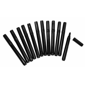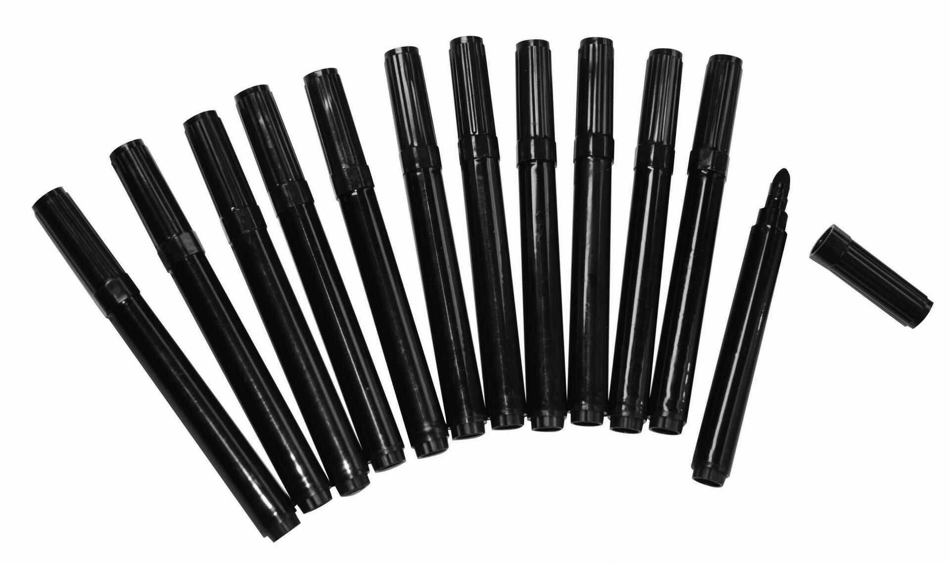 12 st svarta pennor/ask. Fiberpennor från Berol av hög kvalitet. Tålig, bred och rundad spets. Flödigt bläck som passar färgläggning av lite större ytor och inte blöder igenom ritpapper. Ventilerad huv och pennkropp av plast. Pennan kan ligga utan huv i upp till två veckor utan att torka ut. Bläcket kan tvättas bort från kläder, men skydda alltid underlag och textilier vid användande. Linjebredd 1,2 mm. Längd 135 mm. ø 11 mm. CE-märkta. PVC-fri. Från 3 år.