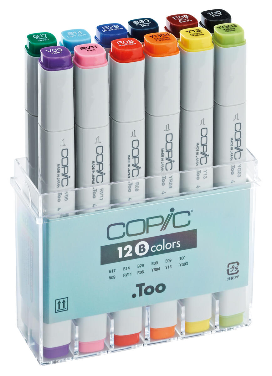 12 st/fp. 12 färger i en pack av COPIC Classic Marker med två spetsar. Passar särskilt bra till animationer och manga- och serieteckning. Ena sidans spets är skuren för större ytor och den andra är spetsig för finare detaljer. Färgerna kan appliceras nära varandra och i lager för blandningar och schatteringar. Innehåller färgerna grön, ljusblå, ultramarin, preussisk blå, bränd sienna, svart, violett, blekrosa, vermilionröd, kromorange, citrongul, blekgrön. Alkoholbaserad. Sörj för god ventilation. Konstnärsmaterial.