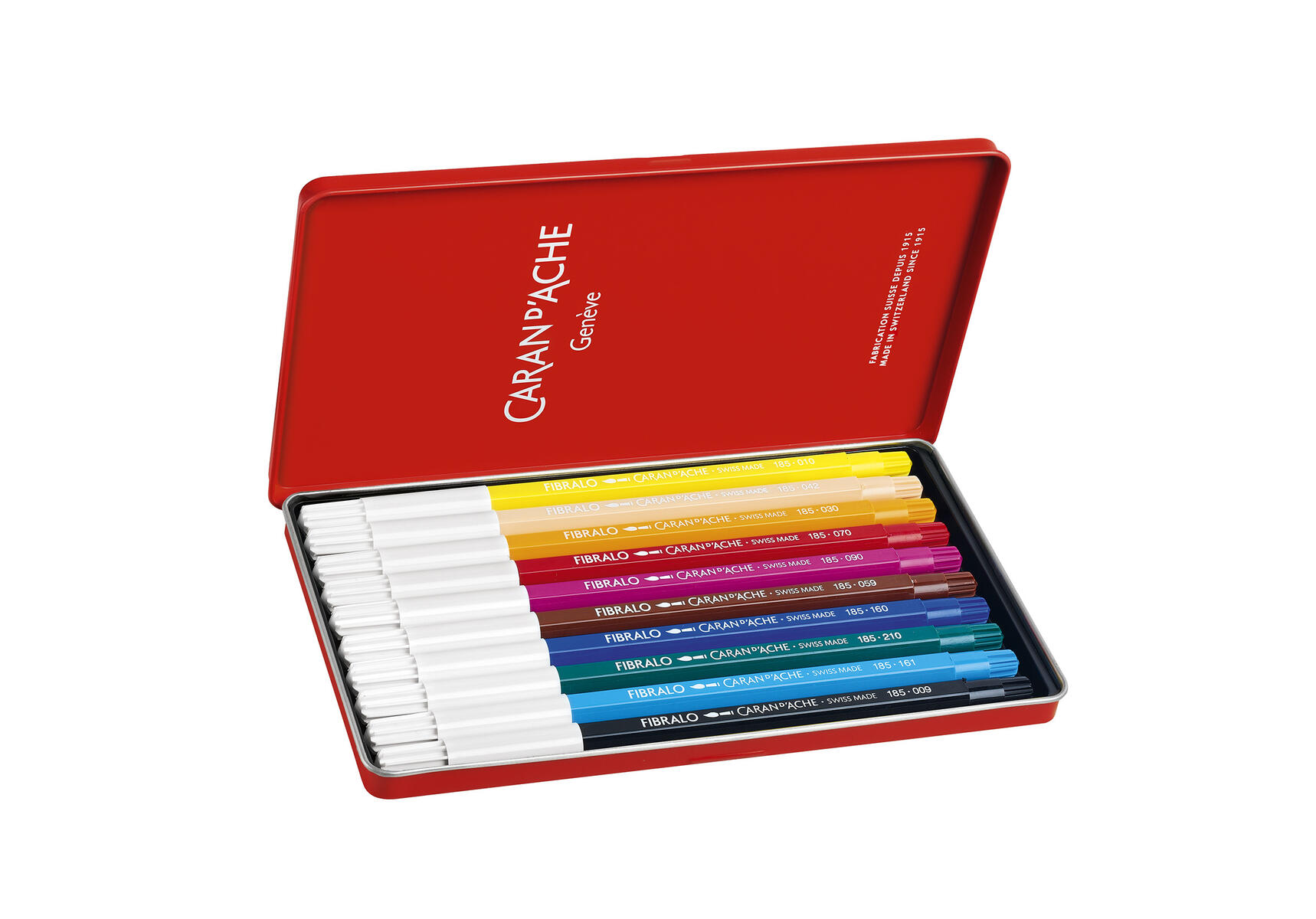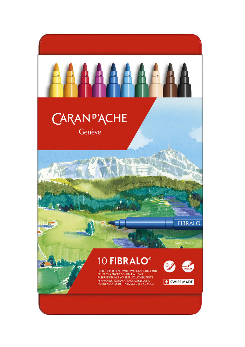 24 st/fp. FIBRALO vattenlöslig fiberpenna. Av absolut högsta kvalitet. Idealiska för teckning, färgläggning, kalligrafi, serieteckning och illustrationer. Pennkropp av plast. Innehåller citrongul, gul, aprikos, orange röd, rosa, cerise, lila, mörkblå, blå, ljusblå, turkos, ljusturkos, mintgrön, lime, grön, ljusgrön, varmbeige, terrakotta, ockra, ljusbrun, brun, ljusgrå, svart. Levereras i exklusivt metalletui. Från 3 år.