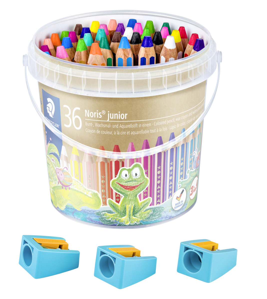 36 st/fp. Tre pennor i en – färgpenna, vaxkrita och akvarellfärgpenna. För papper, kartong, glas m.m. Fungerar även på mörka ytor. Greppvänlig pennkropp, som även passar små händer. Extra kraftigt färgstift. Av PEFC-märkt träråvara. Innehåller 36 pennor i 18 olika färger, samt 3 pennvässare. PVC-fri.