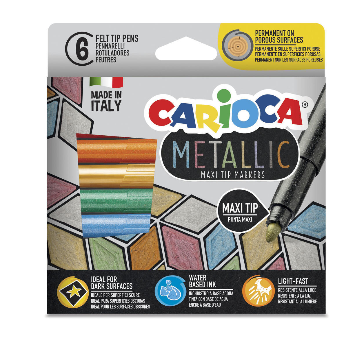6 st/fp. Vattenbaserade fiberpennor med hög täckförmåga, främst för mörka underlag. Fäster på många olika ytor, såsom papper, glas, plast, sten, trä etc. Spetsbredd 4,5 mm. Pennlängd 14,5 cm. Innehåller guld, silver, koppar, blå, grön och röd. Från 3 år.