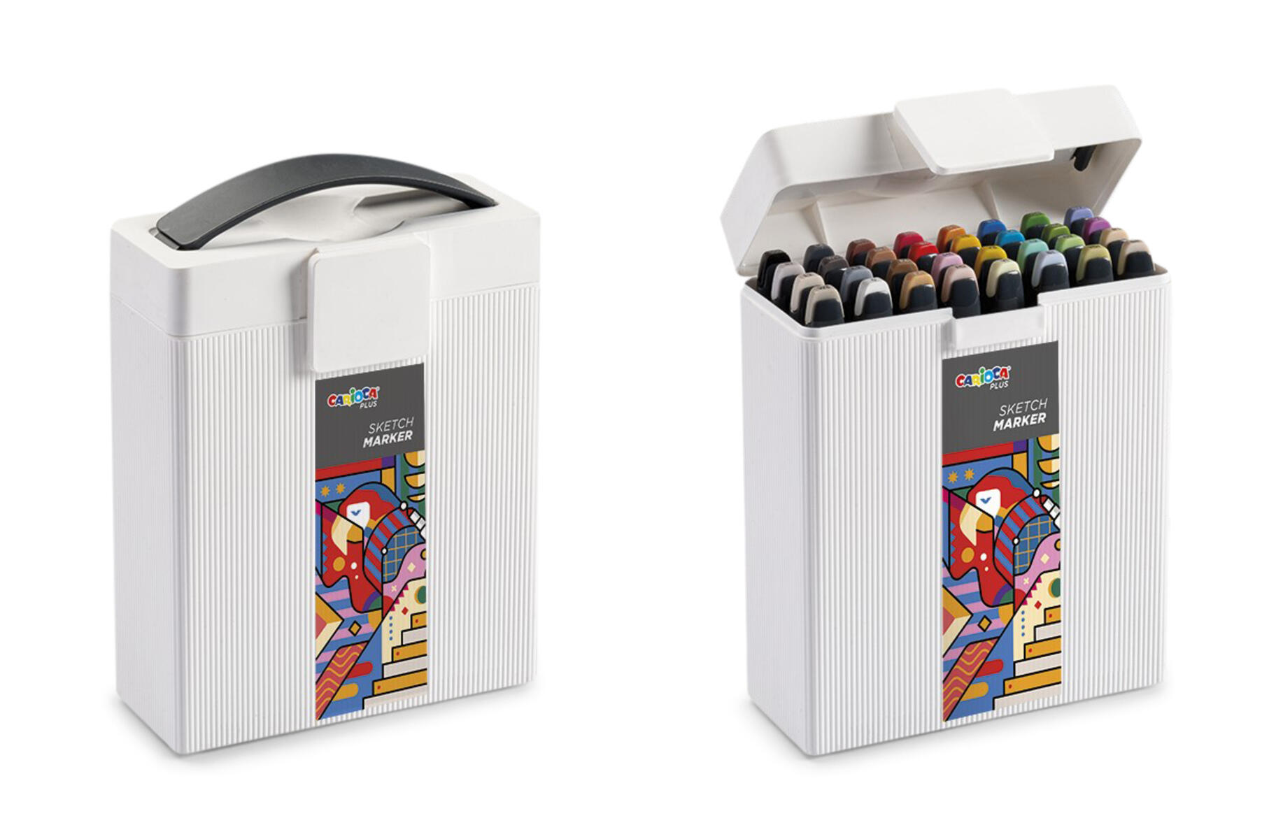32 st/fp. Marker med alkoholbaserat bläck som torkar snabbt. 32 olika färger. Dubbla spetsar, en snedskuren och en penselspets. Färgerna blandas med varandra med fin övergång. Svag lukt. Ergonomiskt grepp.