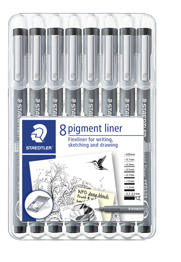 1 st/fp. Fineliner med fiberspets. Lämplig både för att skriva, skissa och teckna. Går utmärkt att använda med linjal. Svart vattenfast pigmentbläck som är syrafritt, ljusbeständigt och dokumentäkta. Kan vara utan kork i 12 timmar utan att torka. Trycksäker. Finns i olika i storlekar.