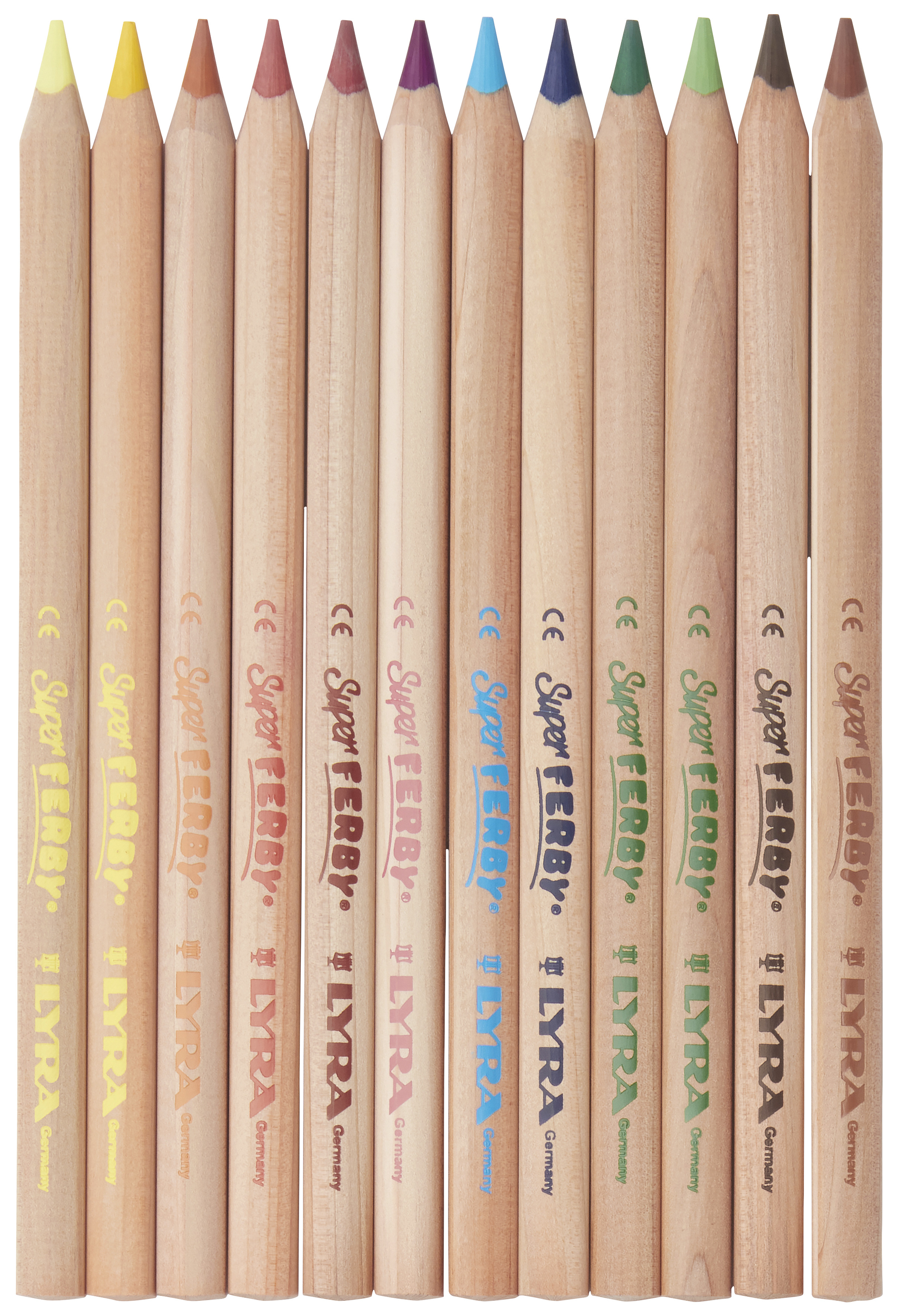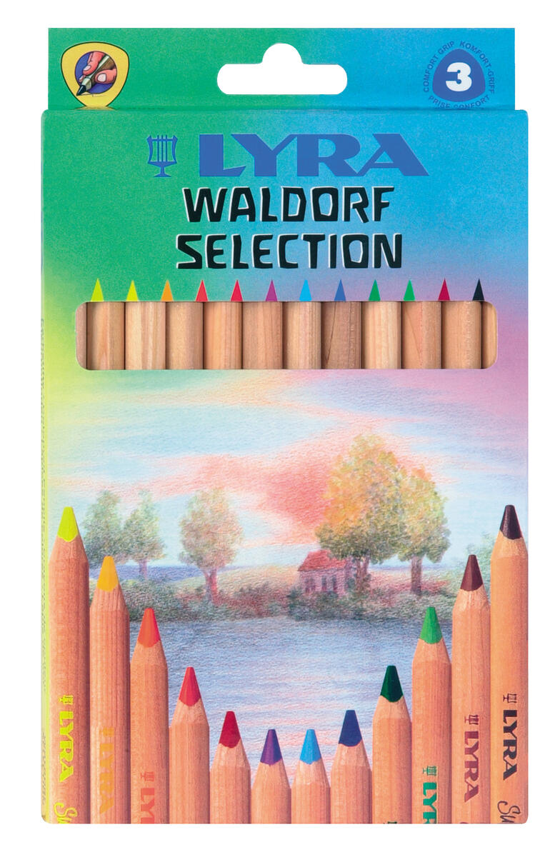 12 st/fp. Lyra Super Ferby med färger som är utarbetade tillsammans med Waldorfskolan. Stora kraftiga trekantiga olackerade pennor. Hellimmat färgstift. PVC-fri.