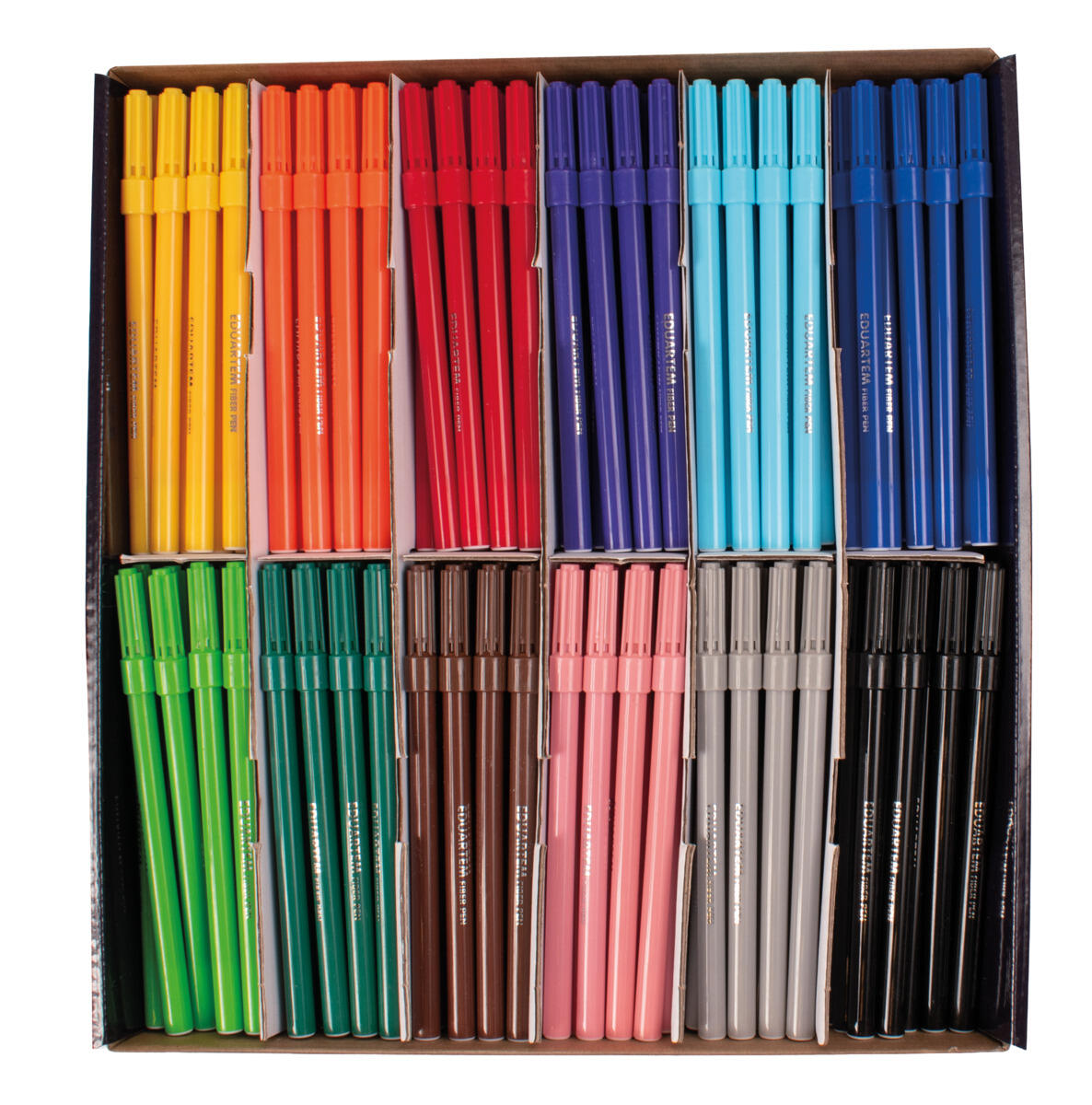 288 st/fp. Smala fiberpennor av god kvalitet. Med tålig spets som inte går att trycka in i pennan, och ventilerad huv. Vattenbaserad. Levereras i praktisk pappersförpackning för förvaring i klassrummet. Färger: gul, orange, röd, ljusblå, blå, lila, ljusgrön, grön, brun, rosa, grå och svart. 12 styck av varje färg. Längd 142 mm. ø 8 mm. Tjocklek spets 2,8 mm. Linjebredd 0,6 mm. Från 3 år. PVC-fri.