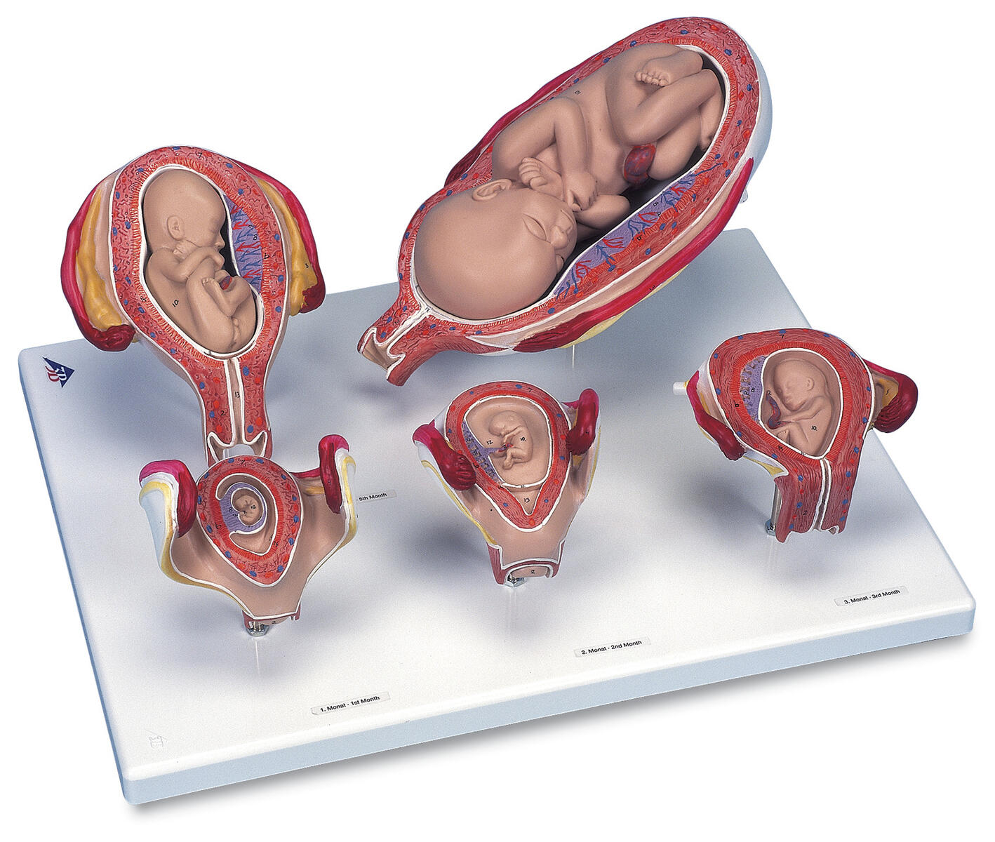 Denna serie visar de viktigaste stadierna i utvecklingen av embryo eller foster. Alla modeller är monterade tillsammans på en bas. 1:a månadens embryo, 2:a månadens embryo, 3:e månadens embryo, 5:e månadsfostret (sittbyte) och 7:e månadens foster.