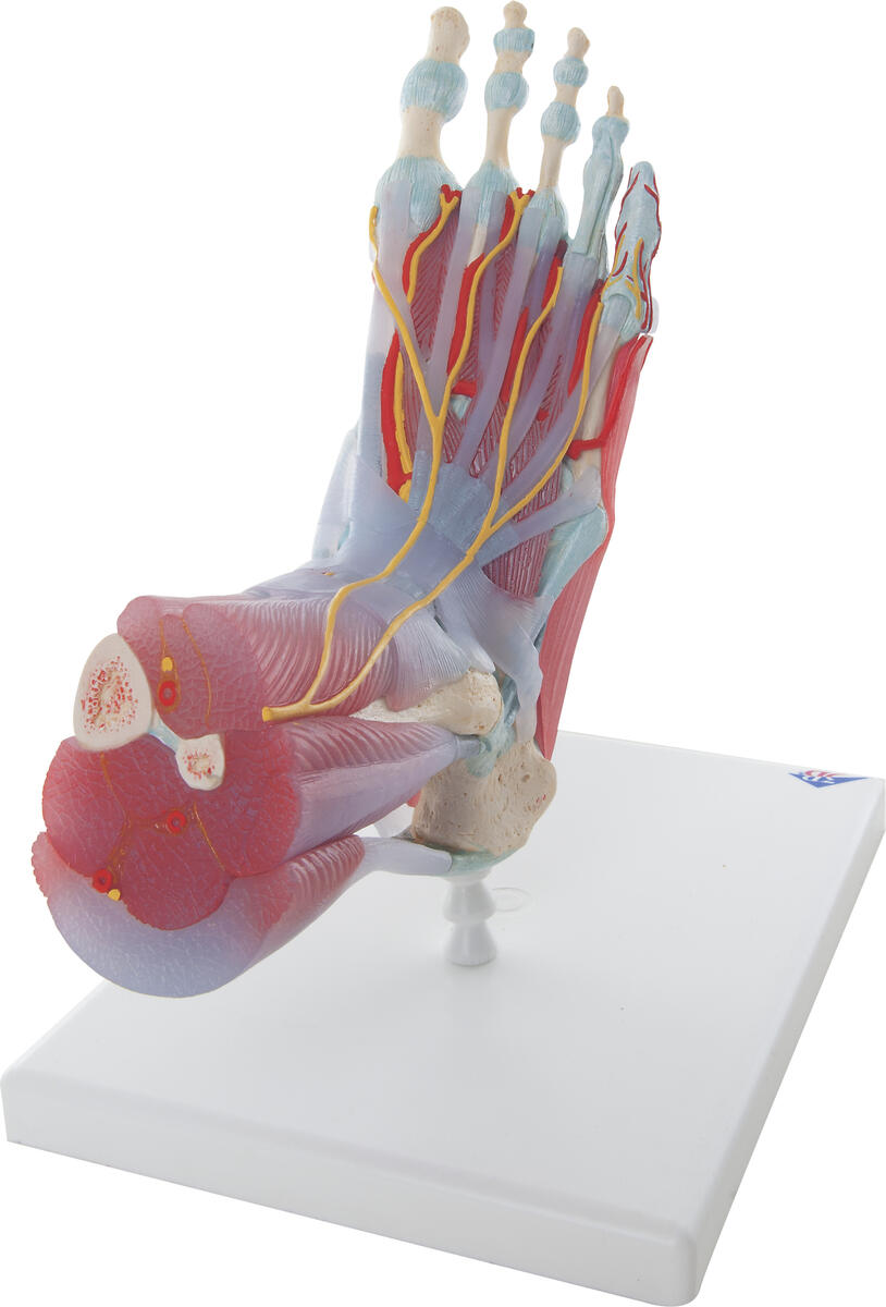 Denna anatomiskt detaljerade modell av foten och underbenet kan demonteras i 6 avtagbara delar för detaljerad studie av foten och fotleden. Fotskelettet har inte bara benen utan också musklerna, senor, ligament, nerver, artärer och vener i foten. Framsidan av fotmodellen visar sträckmusklerna i underbenet. På den dorsala delen av foten är gastrocnemius-muskeln avtagbar för att avslöja djupare anatomiska element. Fotsulan är representerad i tre lager där bl.a. flexor digitorum brevis, quadratus plantae, senan i flexor digitorum longus och flexor hallucis-muskeln ingår.