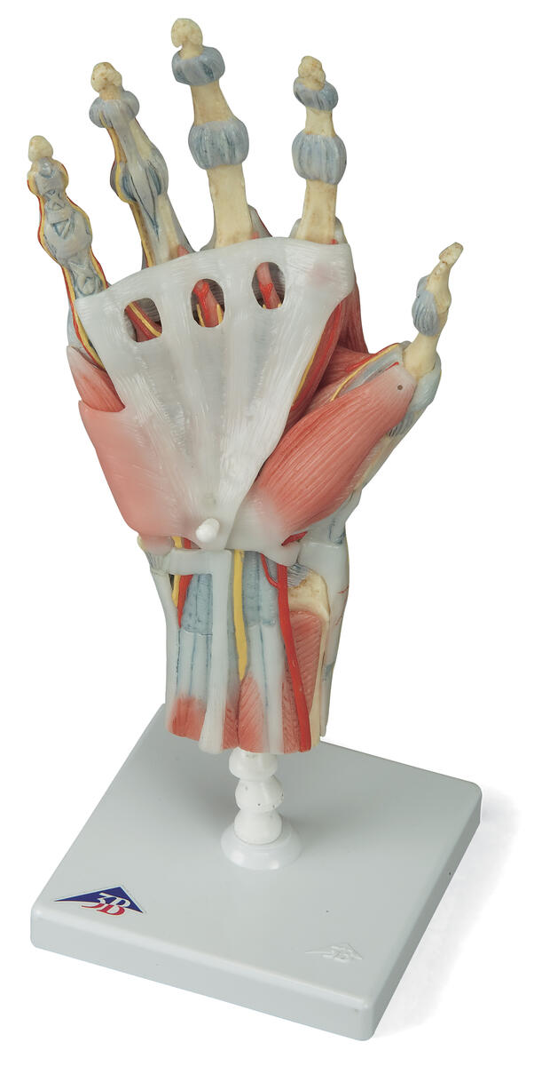 Ben, muskler, senor, ligament, nerver, artärer och vener finns alla med i denna högkvalitativa modell av handen och underarmen i fyra delar. Den dorsala sidan av handen visar sträckmusklerna såväl som delar av senor vid handleden när de passerar under extensor retunaculum. Handens palmaryta är representerad i tre lager, de två första är borttagbara för att möjliggöra detaljerade studier av det djupare anatomiska lagret av handen. Dessutom kan kliniskt viktiga strukturer som medianusnerven och ytlig palmarartärbåge utforskas i detalj i handmodellen. Det djupaste anatomiska lagret möjliggör studier av de inneboende musklerna och den djupa artärbågen i handflatan förutom andra detaljer om handens anatomi.
