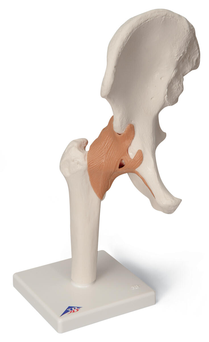 Denna funktionella höftledsmodell i naturlig storlek visar tydligt anatomin och mekaniken hos den mänskliga höftleden. Modellen visar abduktion, anteversion, retroversion och intern/extern rotation och består av en del av lårbenet, höftbenet och ledbanden. Levereras på stativ.