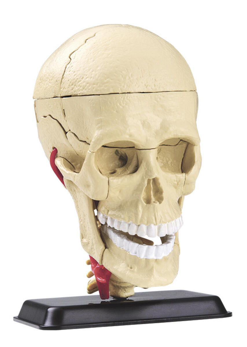 Skelettmodell av benen i kroppen. Naturlig skelettstorlek och monterad skalle i tre delar med magnetiska anslutningar. Individuellt insatta tänder. Lemmarna kan tas bort snabbt och enkelt. Levereras med metallstativ och transparent dammskydd.