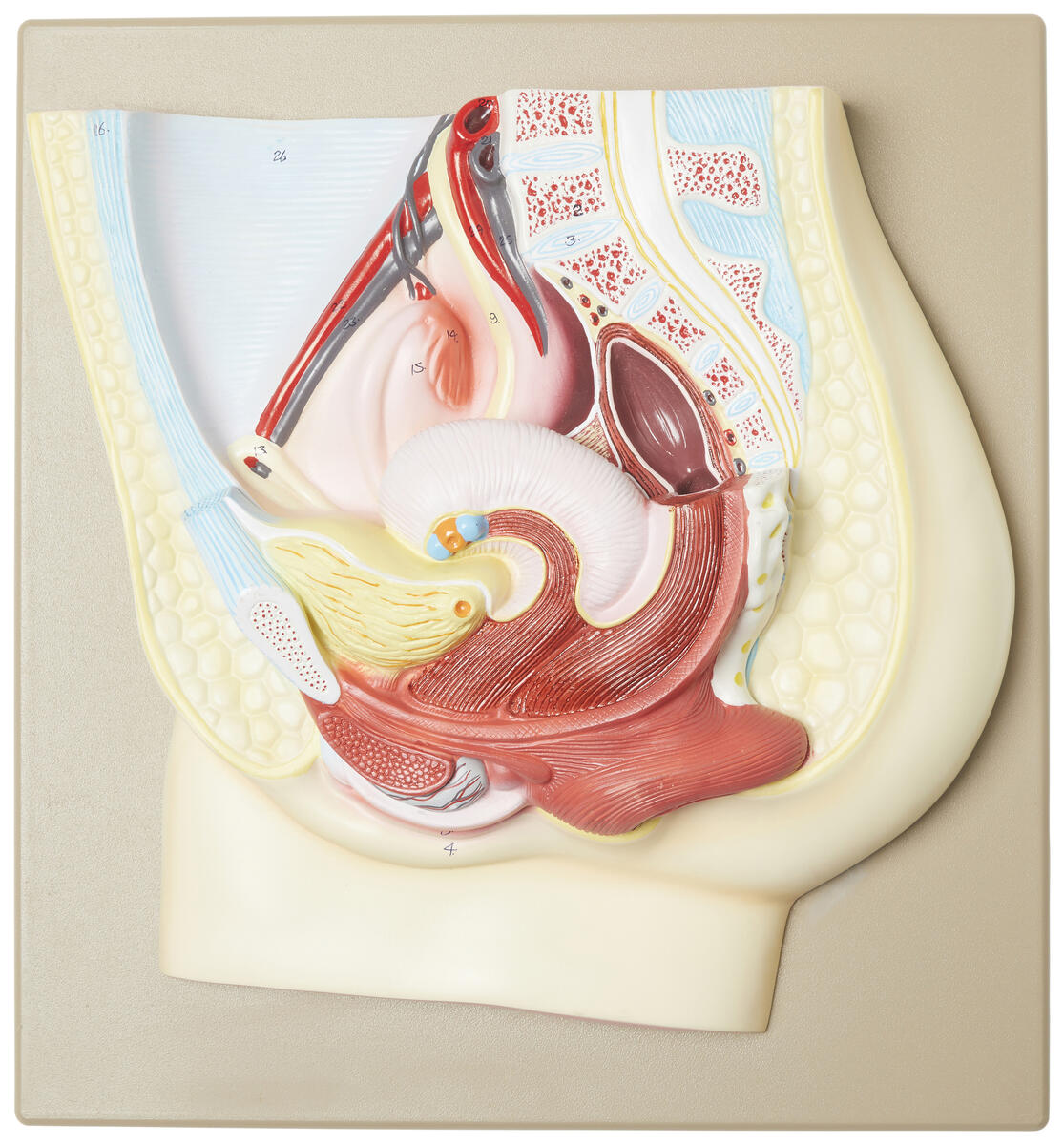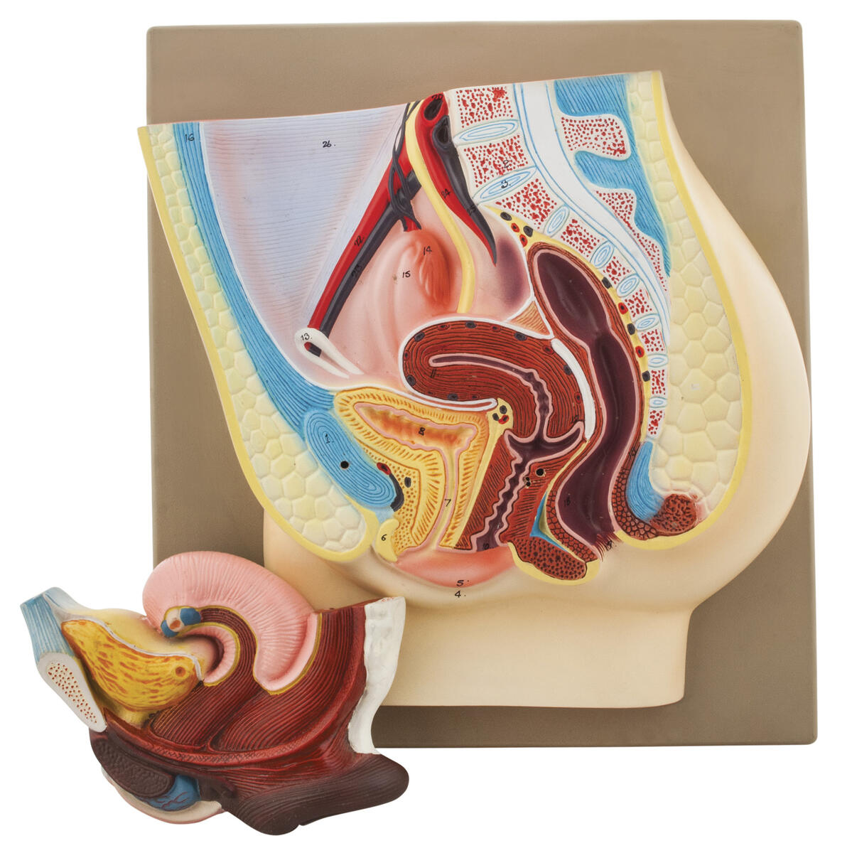 3D-modell av kvinnligt bäcken med avtagbar blåsa och rektum för studie av det kvinnliga reproduktionssystemet. Visuellt hjälpmedel för kurser i medicinsk anatomi och fysiologi.