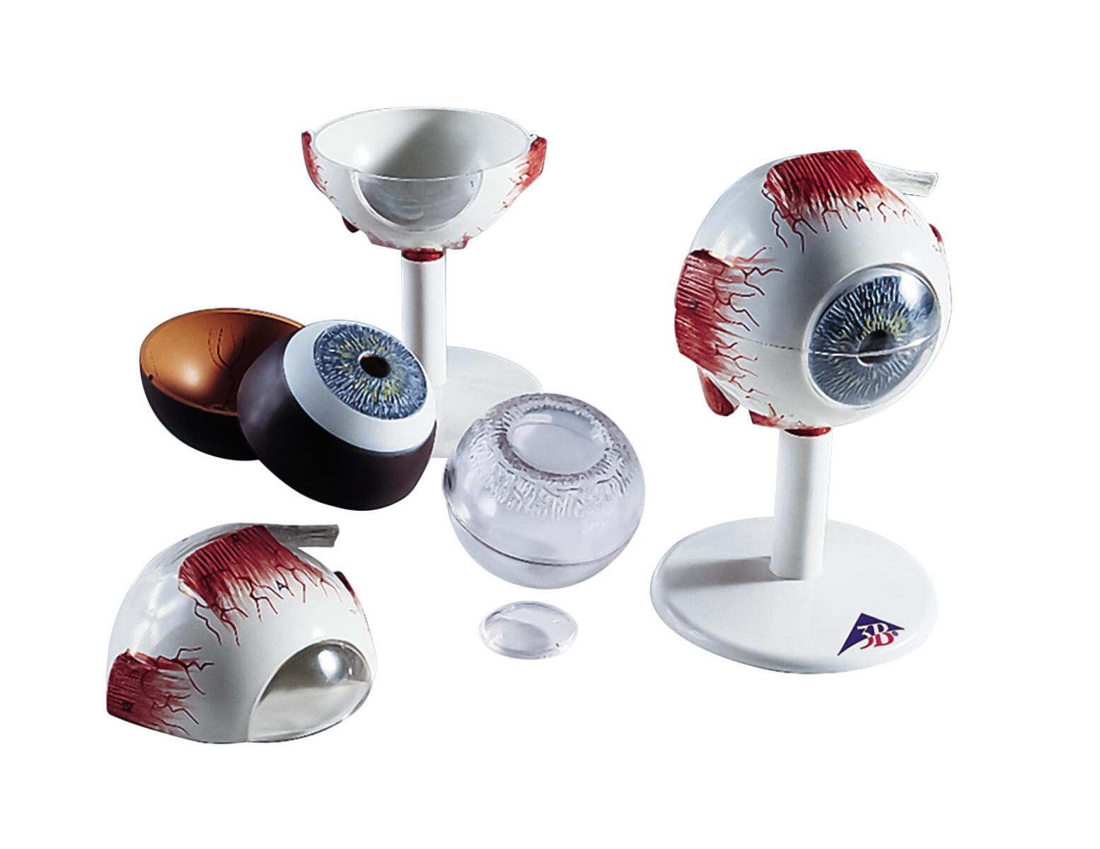 En modell på stativ i sex delar som visar hur ögat är uppbyggt. 5x naturlig storlek. Senhinna, åderhinna, hornhinna, glaskropp och lins. Av hög kvalitet.