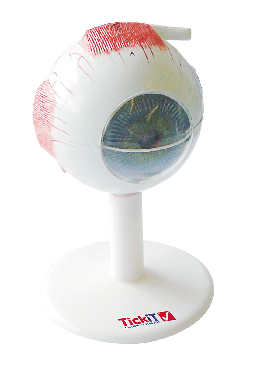 En modell på stativ i sex delar som visar hur ögat är uppbyggt. 5x naturlig storlek. Senhinna, åderhinna, hornhinna, glaskropp och lins. Av hög kvalitet.