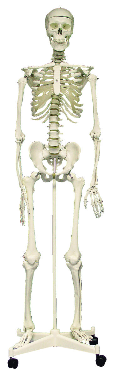Skelettmodell av benen i kroppen. Naturlig skelettstorlek och monterad skalle i tre delar med magnetiska anslutningar. Individuellt insatta tänder. Lemmarna kan tas bort snabbt och enkelt. Levereras med metallstativ och transparent dammskydd.